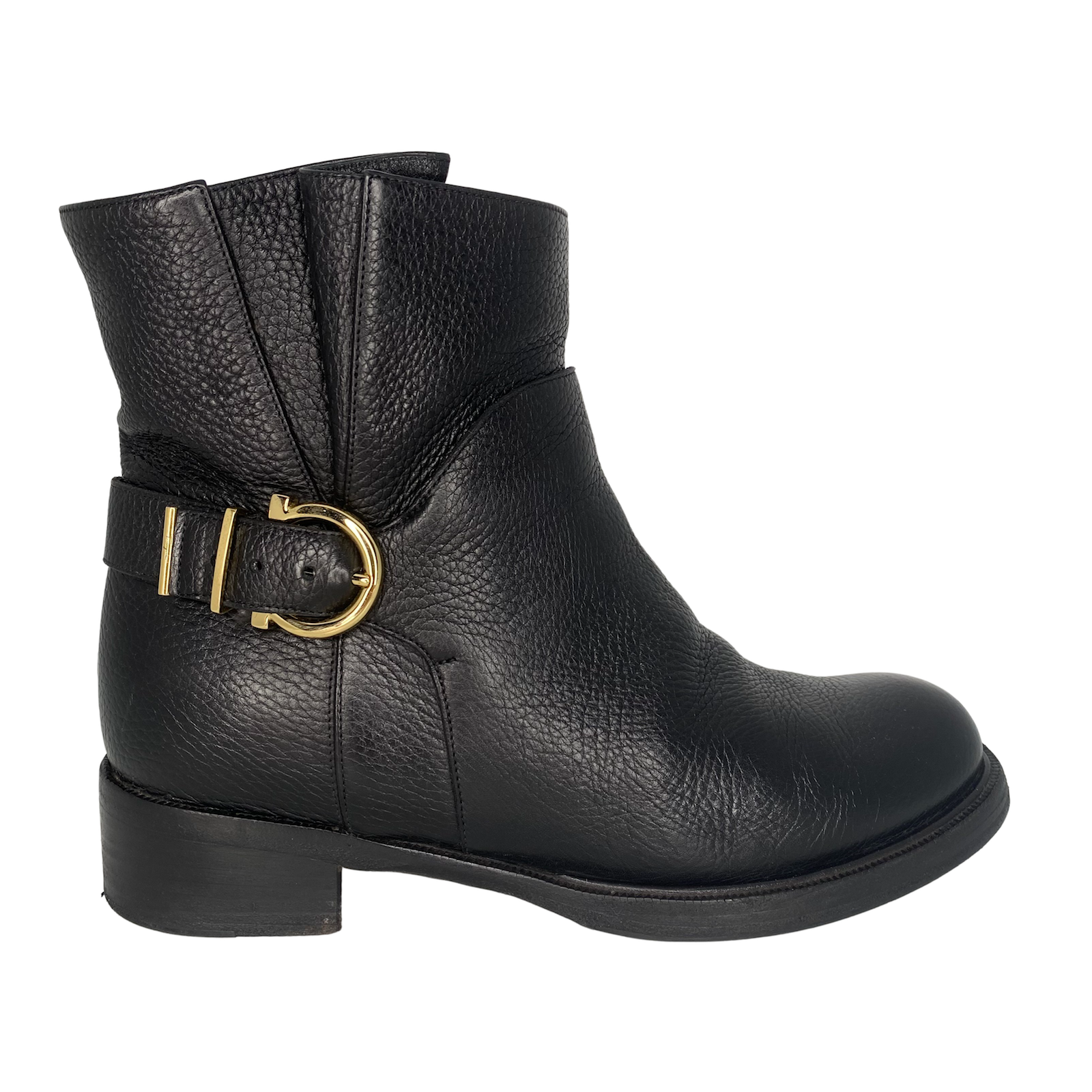 "czarne skórzane botki za kostkę, złota klamra z zapięciem z boku, używane, widoczne zniszczenia na flekach, beżowe wnętrze ze śladami użytkowania. Rozmiar 38, pudełko."