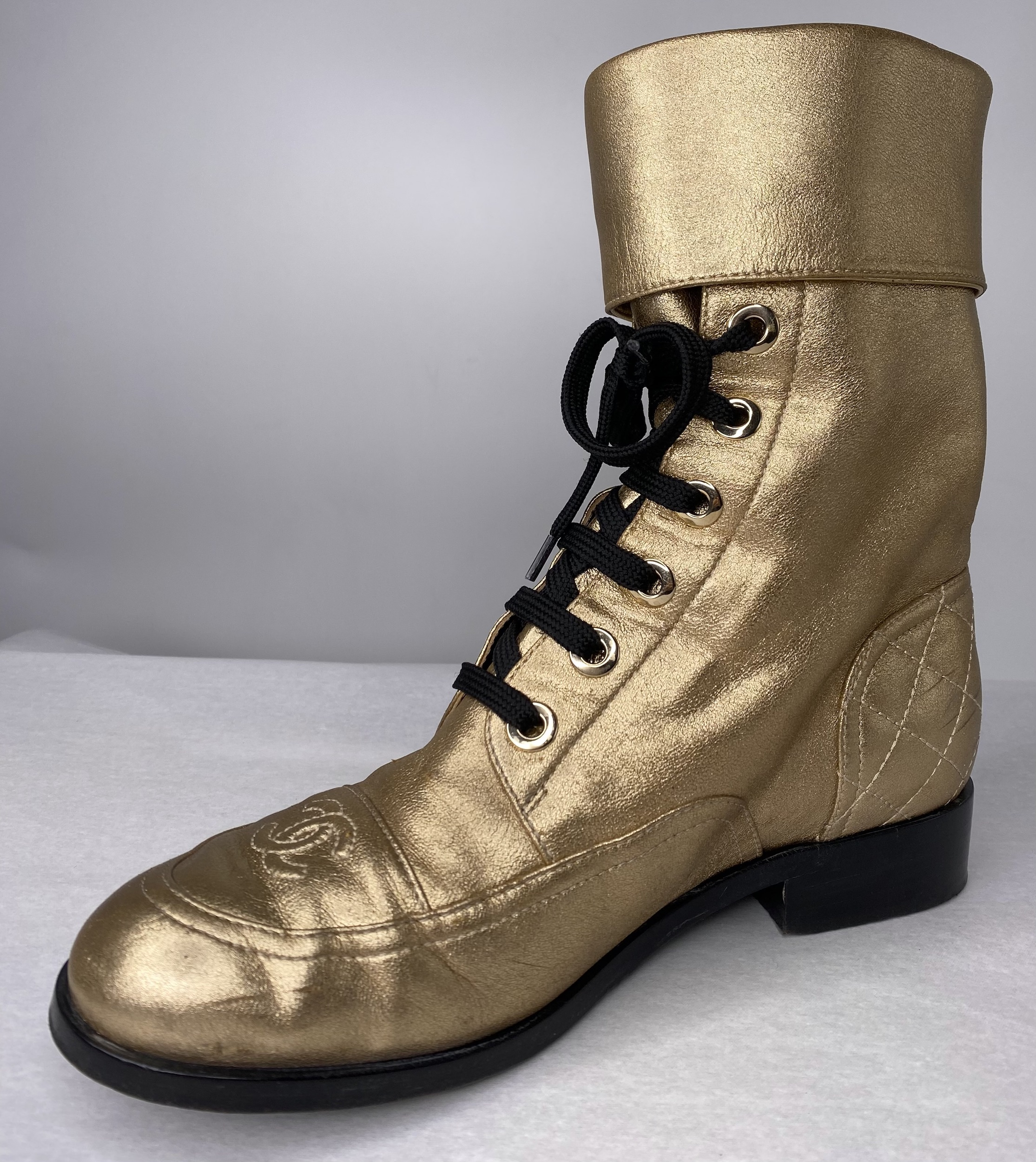 "złote botki, sznurowane, z tyłu zapinane na suwak, pikowane na pięcie, z przodu wyszywane logo, czarna podeszwa, używane stan bardzo dobry, ślady użytkowania na podeszwie, pudełko. Rozmiar 36."