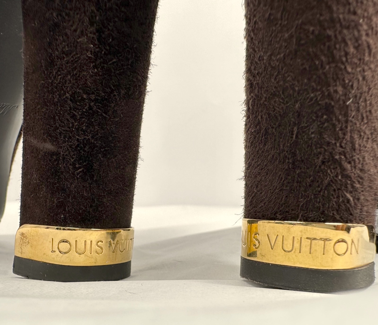 "Brązowe botki z zamszowej skóry na słupku. Mają obcas obleczony metalową blaszką w kolorze złotym z grawerowanym logo. Ich nosek ułożony jest na kształt migdału. Stan: db, niewielkie zużycie skóry. Rozmiar: 38,5. Dł wkładki: 25 cm. Skład: cholewka: 100% skóra zamszowa wkładka: 100% skóra naturalna, podeszwa: tworzywo sztuczne. Wys. obcasa: 11 cm."