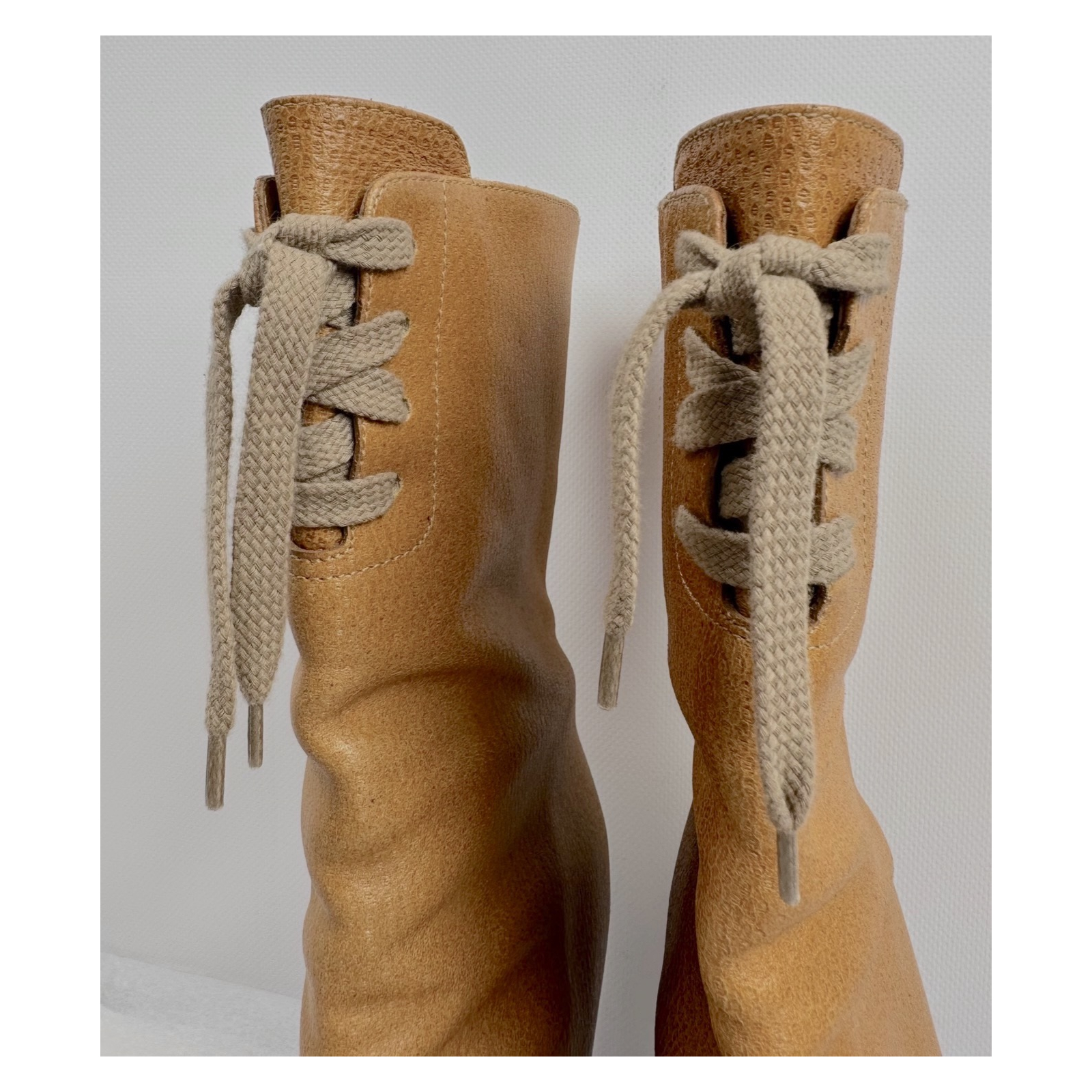 "Miodowe, skórzane botki z wiązaniem. Mają wiele charakterystycznych cech: wyciągniętą na nosek buta gumową podeszwę z dodatkowym pionowym wzorem, wiązanie u szczytu cholewki na beżową sznurówkę (przekładaną przez cztery dziurki) oraz dość wysoki obcas typu słupek. Skóra na cholewce jest fabrycznie pozaginana. Stan: bardzo dobry, mają nieznaczne przetarcia. Rozmiar: 38. Dł. wkładki: 24 cm. Skład: cholewka: 100% skóra naturalna, wkładka: 100% skóra naturalna, podeszwa: tworzywo sztuczne. Wys. obcasa: 11,5 cm., wys. podeszwy: 0,5 cm."