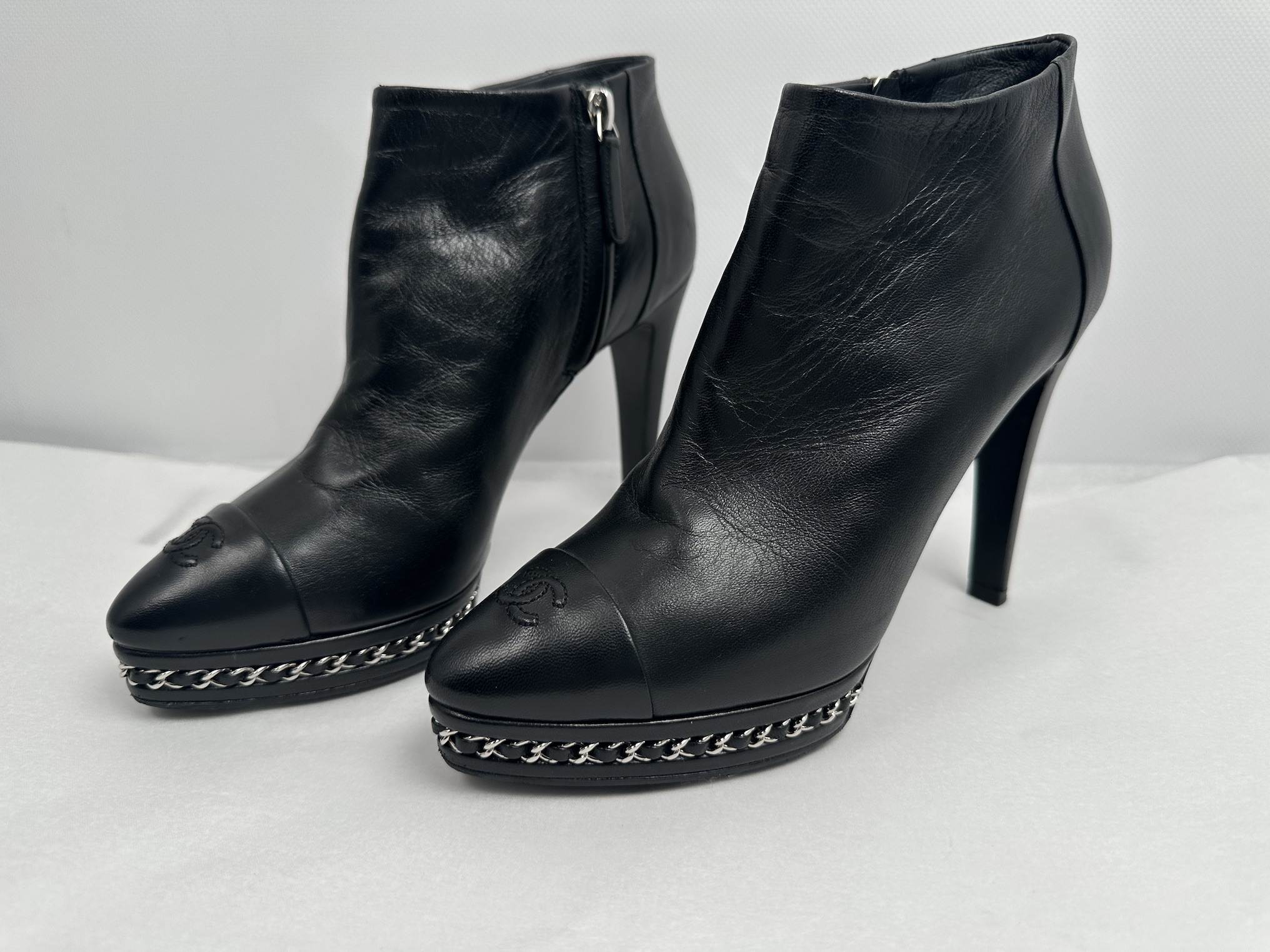 "(Chanel Black Leather CC Chain Link Ankle Booties.) Botki z czarnej skóry. Mają wyciągnięty w szpic nosek, dodatkowo ozdobiony przeszyciami z logo. Osadzone są na niewysokiej platformie (2 cm) ze srerbym łańcuszkiem. Po boku mają, ułatwiający wzuwanie, suwak. Rozmiar: 38. Dł wkładki: 24 cm. Stan: bardzo dobry. Skład: cholewka: 100% skóra naturalna wkładka: 100% skóra naturalna, podeszwa: tworzywo sztuczne. Wys. obcasa: 11 cm."