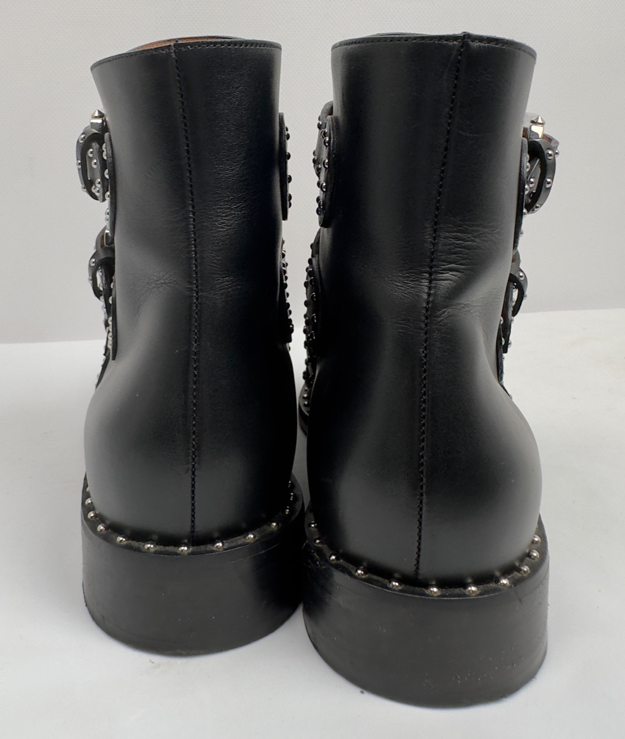 "czarne skórzane botki, ze srebrnymi nitami zapinane na 4 paski ze sprzączkami. Starta podeszwa. Brak informacji o rozmiarze, wypadają na 39."