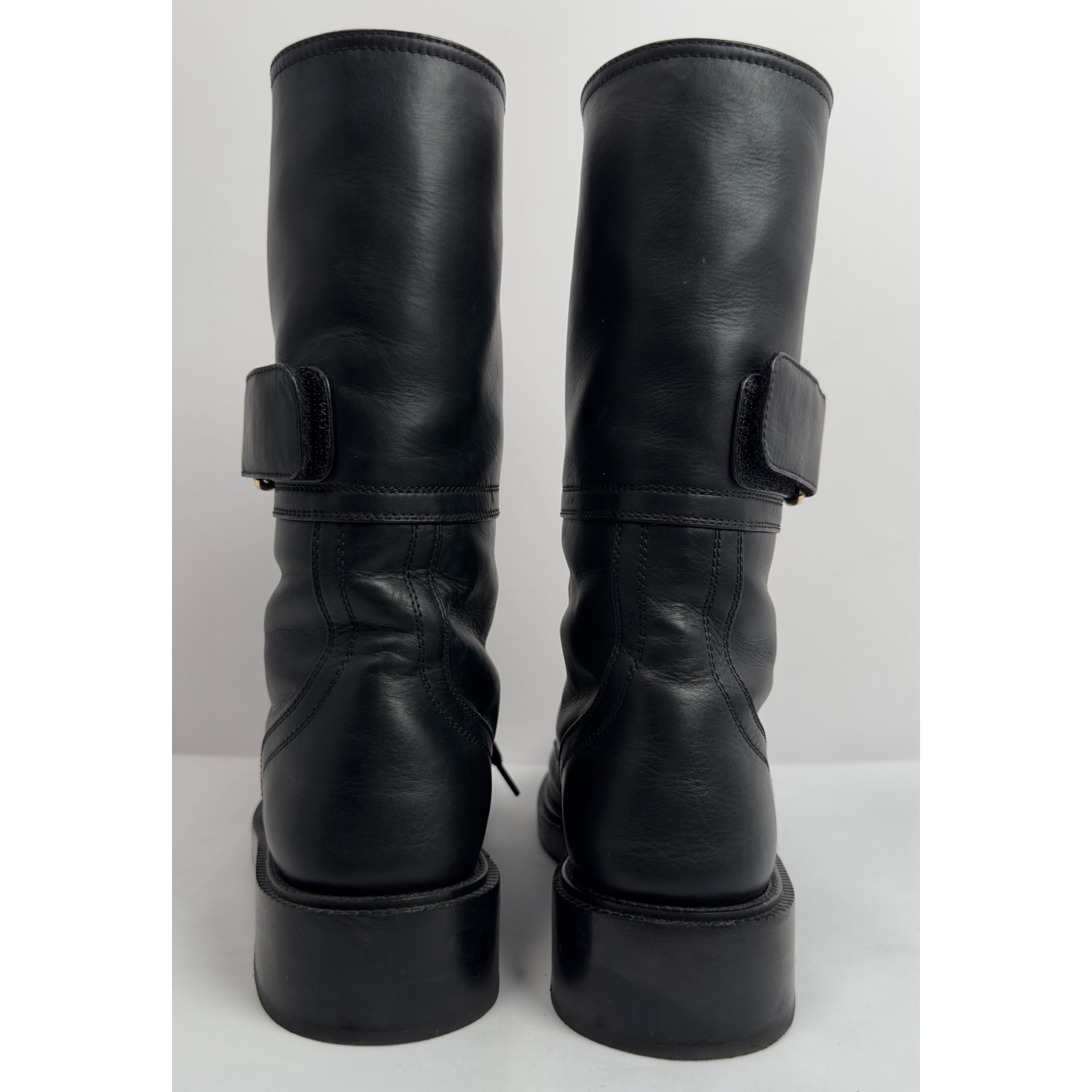 "Czarne skórzane botki, wysoka cholewka, sznurowane oraz zapinane na rzepę z dużym złotym metalowym logo marki na przodzie, niski obcas, zaokrąglone noski wykończone sztywnym materiałem, ozdobne przeszycia, w zestawie z pudełkiem i workiem przeciwkurzowym, używane. Stan bardzo dobry, lekko pomarszczona skóra, wytarta podeszwa. Rozmiar 36,5."