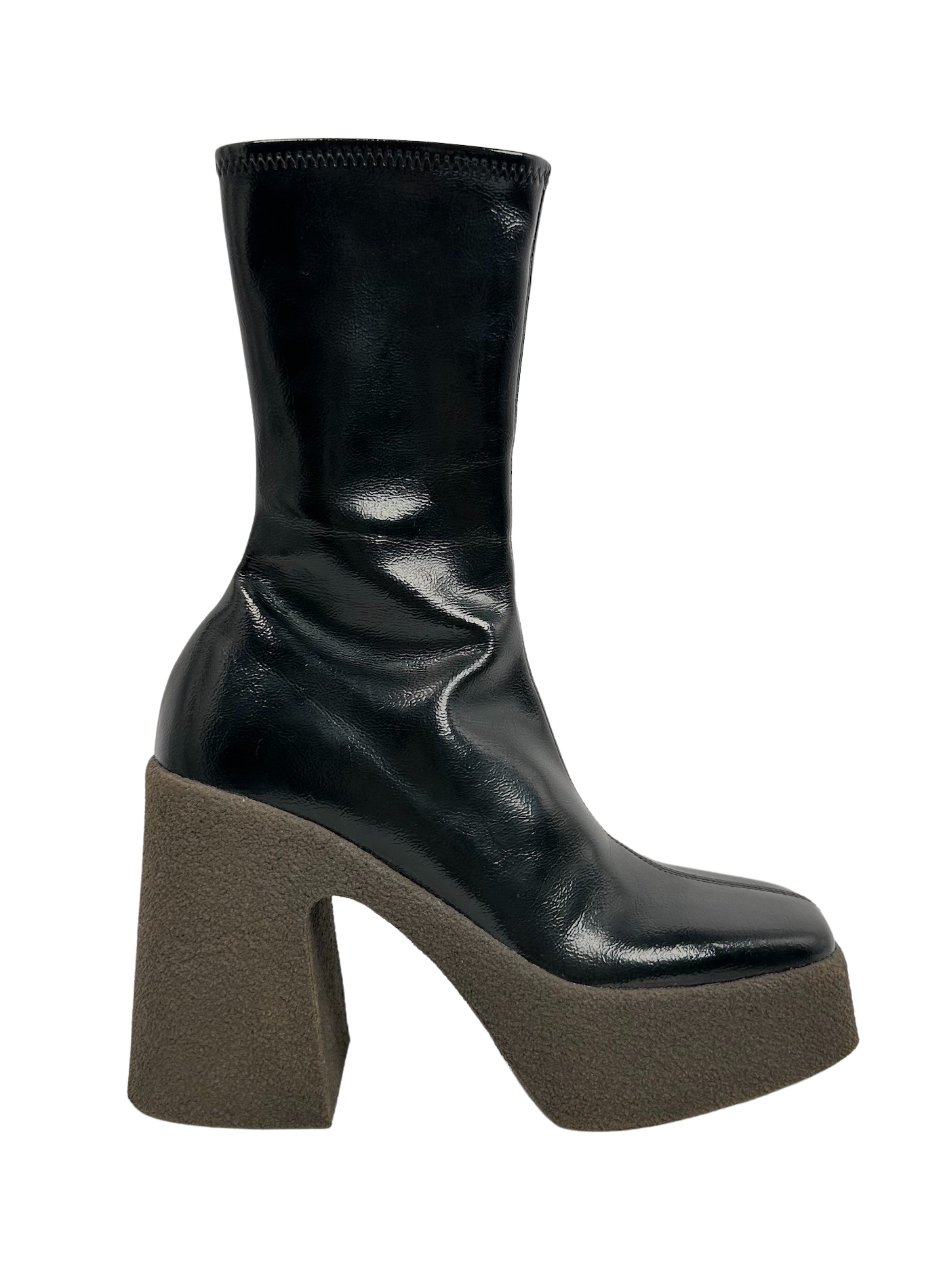 "Czarne skórzane botki na obcasie i platformie w kontrastowym brązowym kolorze, zasuwane po wewnętrznej stronie na suwak, ścięte noski, w zestawie z workiem przeciwkurzowym, używane. Stan bardzo dobry, lekko wytarta przednia część podeszwy. Rozmiar 35."