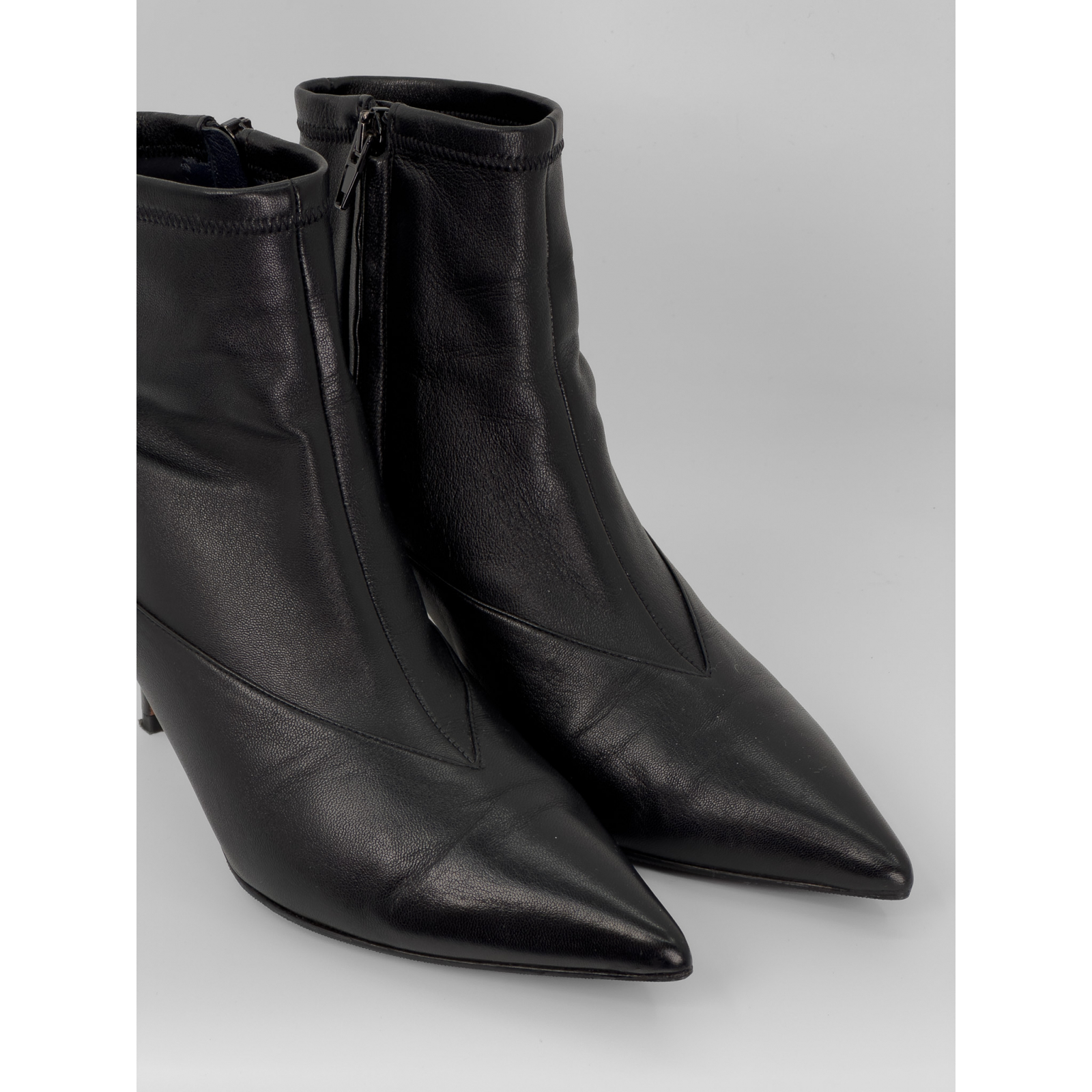 "Czarne skórzane botki na obcasie ozdobione przeszyciami, nosek w szpic, miękka skóra, dopasowana cholewka, zapinane od wewnętrznej strony na suwak, obcas kaczuszka, w zestawie z workiem przeciwkurzowym, używane. Stan dobry, marszczenia na skórze, przetarcia na podeszwie oraz flekach. Rozmiar 36."