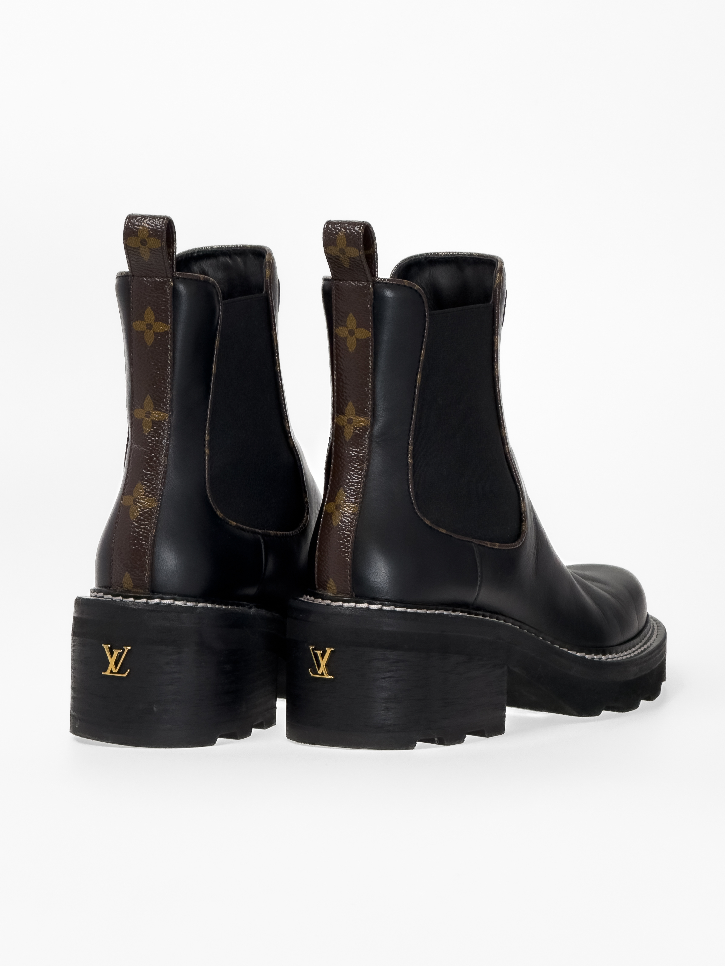 "LV Beaubourg Ankle Boot 1670 usd; Czarne skórzane botki na obcasie, ozdobione białą nitką przy podeszwie, wsuwane, guma po bokach, brązowa wstawka we wzór charakterystyczny dla marki po bokach oraz wykończona pętelką w tylnej części, zaokrąglone noski, złote logo marki na cholewce oraz obcasie, w zestawie z pudełkiem. Stan dobry, marszczenia na skórze, przetarcia na noskach. Rozmiar 38,5."