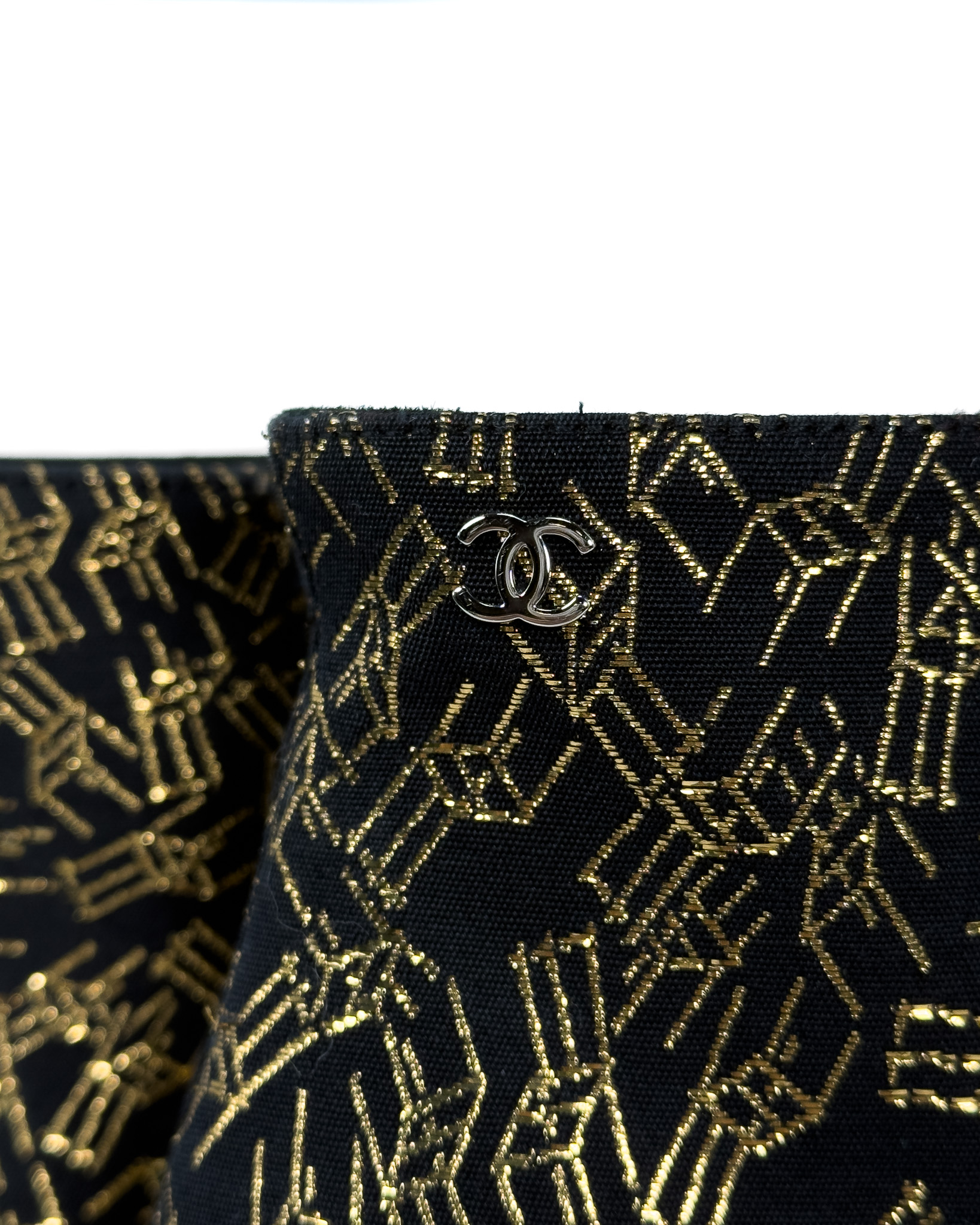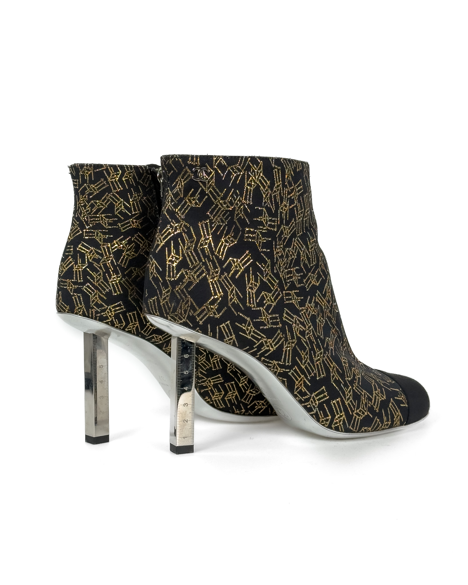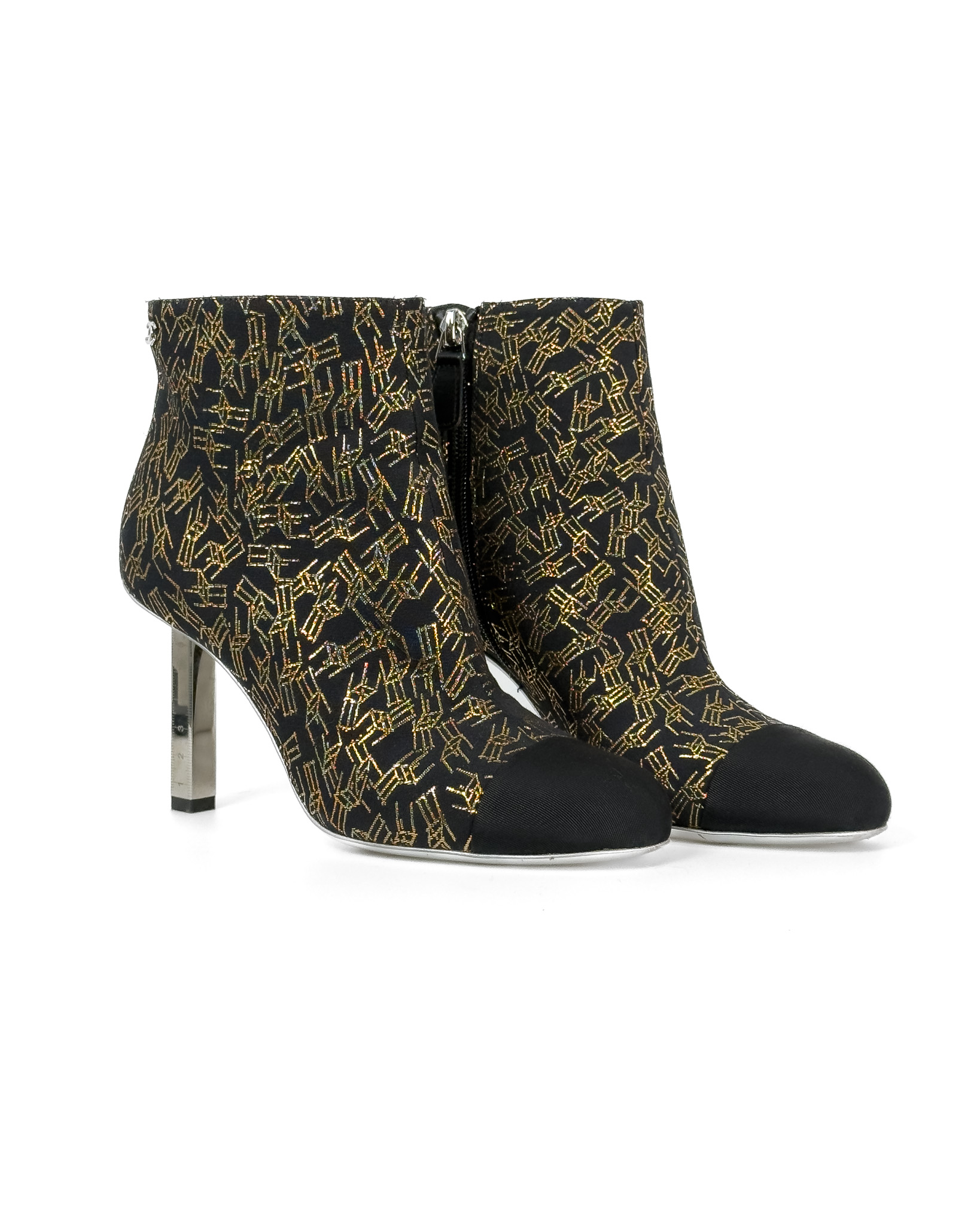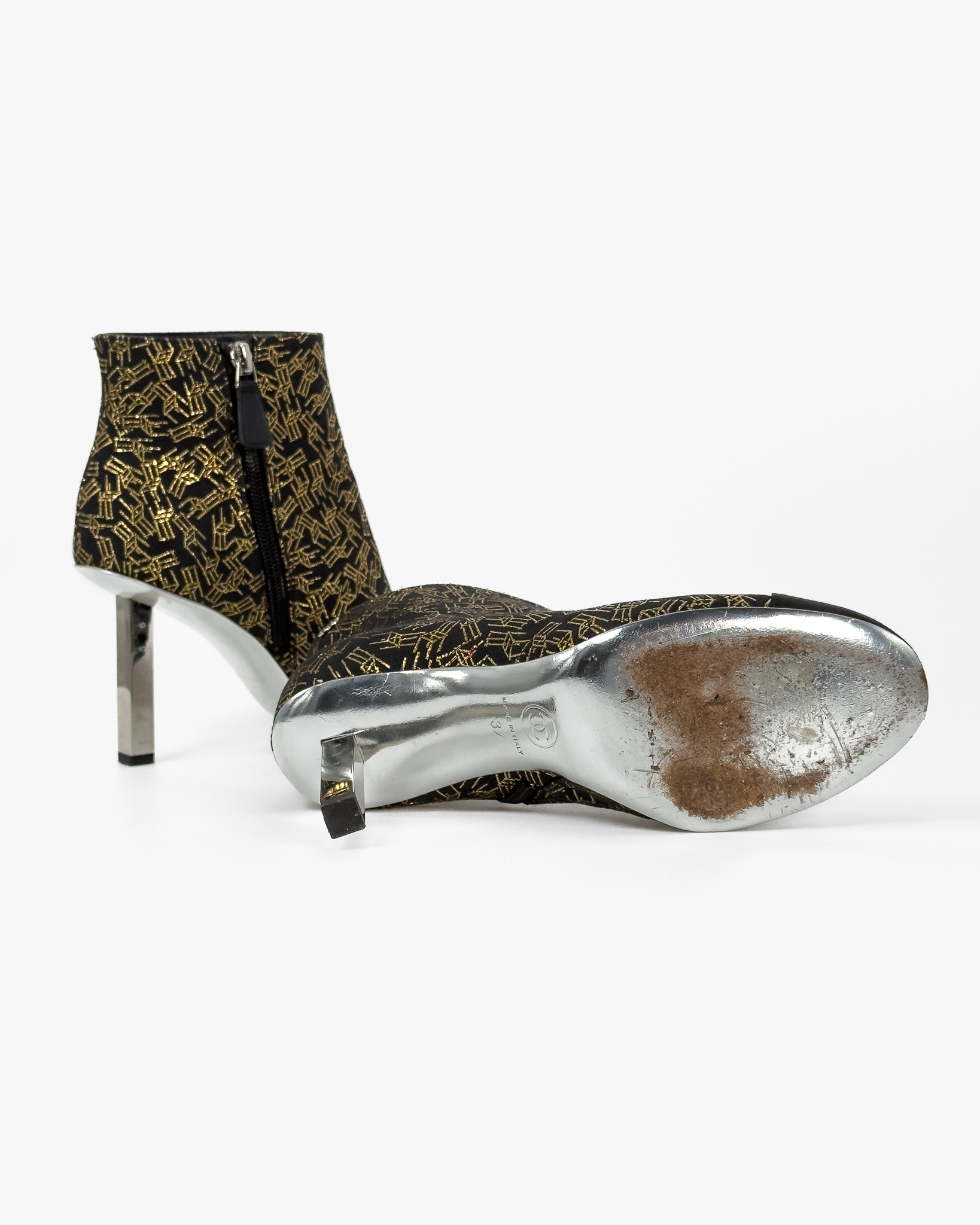 "Czarne materiałowe botki we wzór złotych krzeseł, srebrny obcas z imitacją centymetra, zaokrąglone noski, delikatne srebrne logo marki na wykończeniu cholewki, zapinane na suwak od wewnętrznej strony, worek przeciwkurzowy w komplecie. Stan bardzo dobry, delikatne przetarcia na podeszwie. Rozmiar 37, wysokość obcasa 7cm."