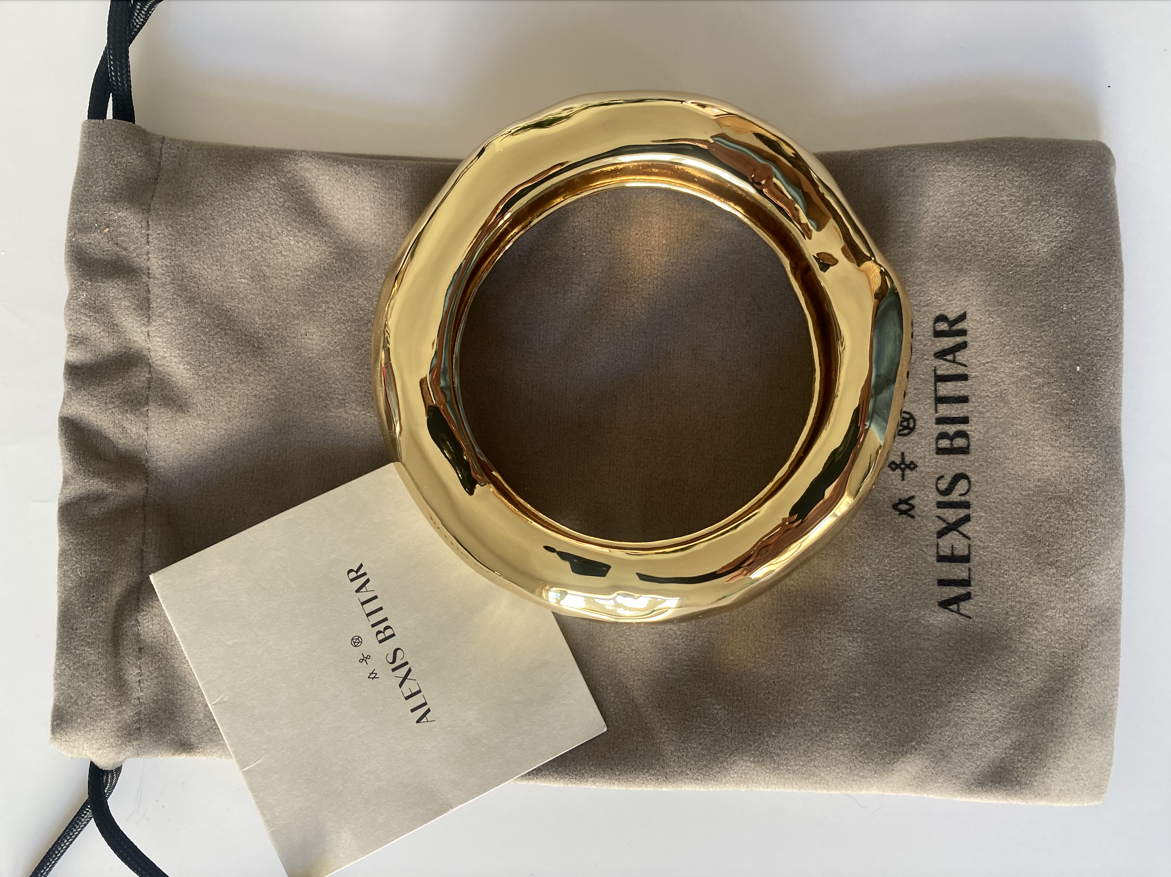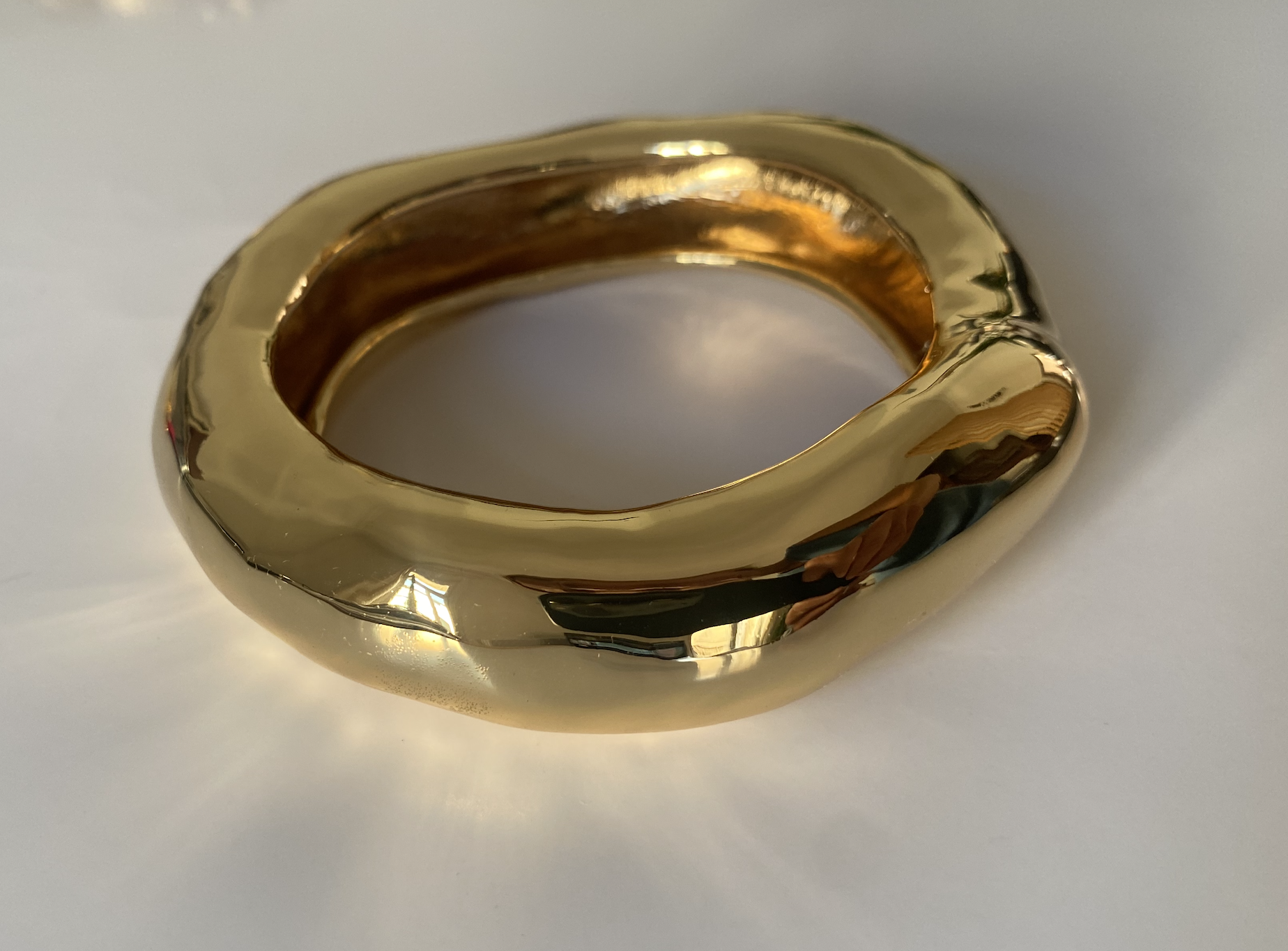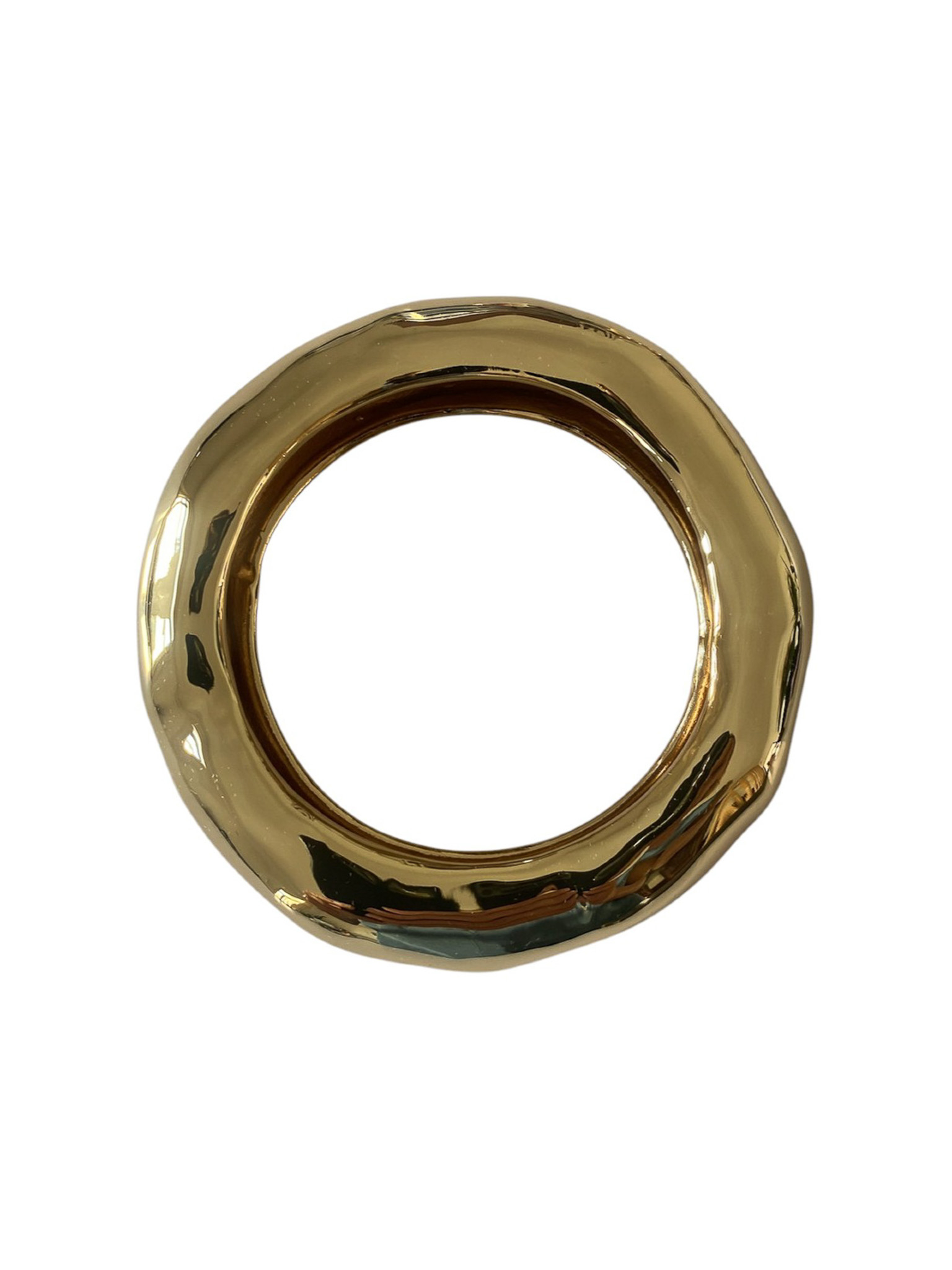 "Złota bransoletka, wkładana, sztywna, okrągły kształt, pozłacana 14k złotem, połyskująca. Stan nowa; wymiary: średnica 6,5 cm."