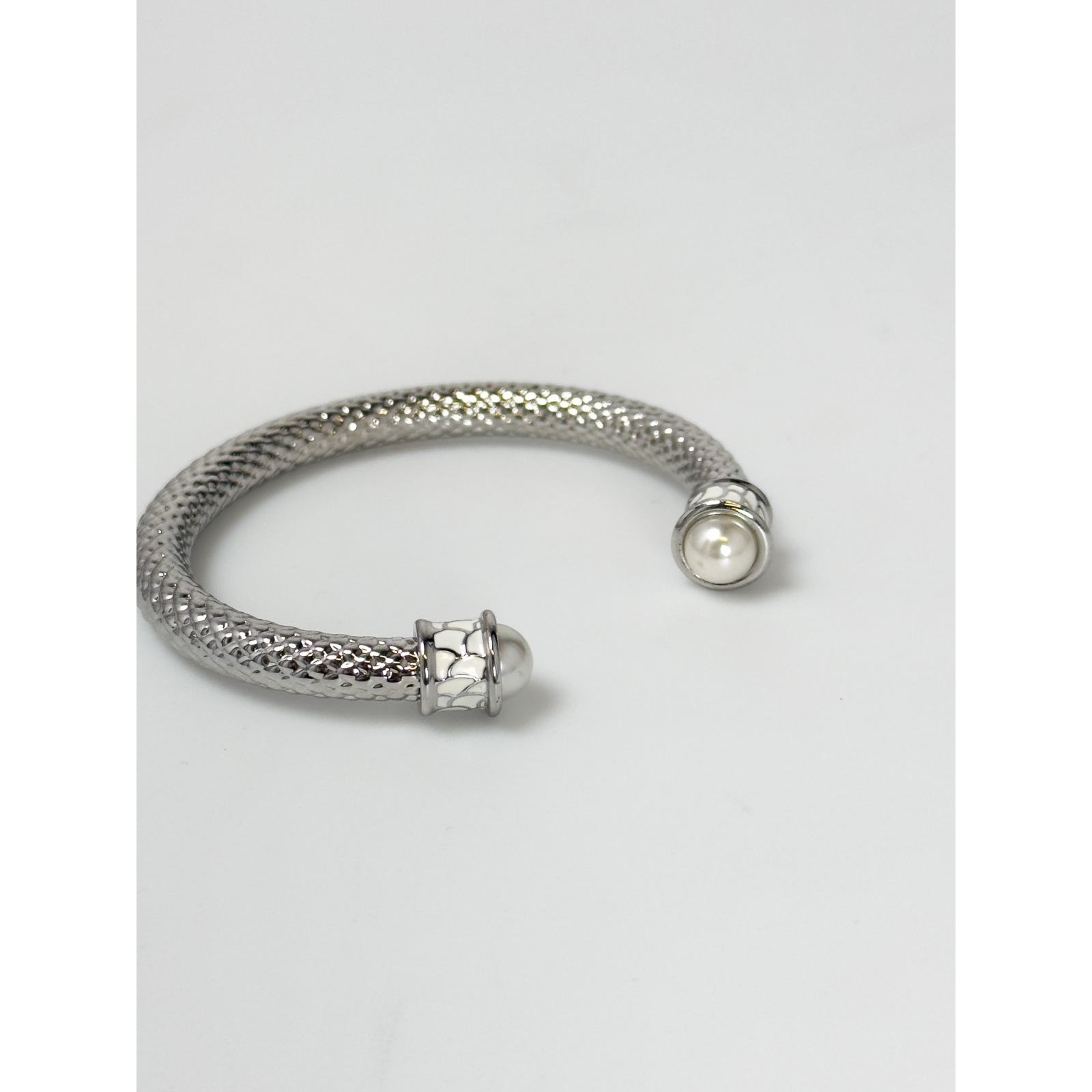 "Srebrna bransoletka, połyskująca, sztywna, wkładana, ozdobiona perłami oraz wstawkami w kolorze mlecznym, w zestawie z woreczkiem przeciwkurzowym oraz pudełkiem."