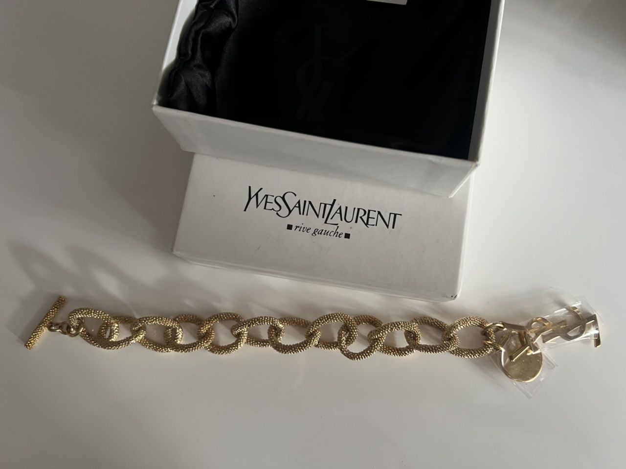 "Bransoletka YSL złotego koloru w idealnym stanie ( raz założona ) w kompletnym opakowaniu."