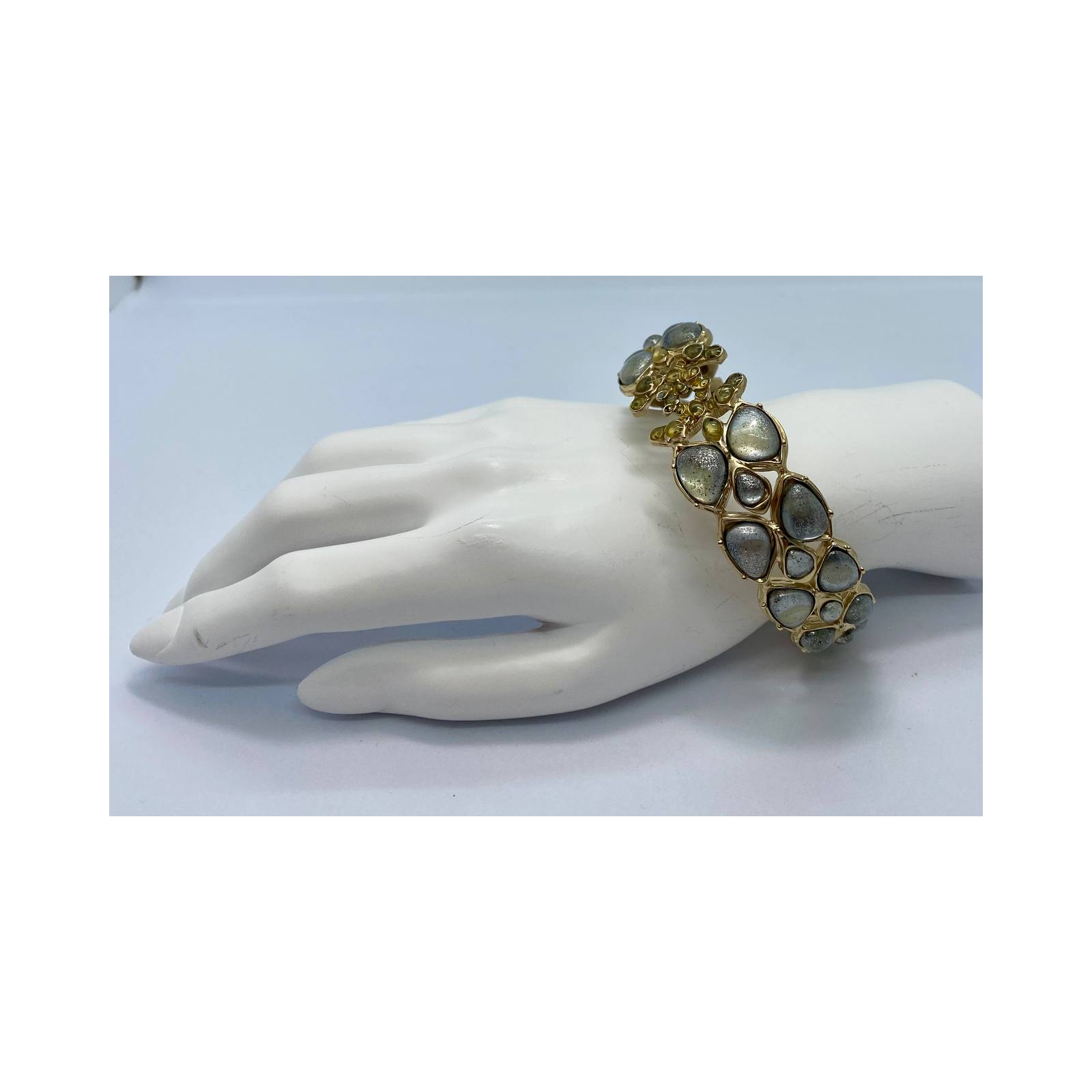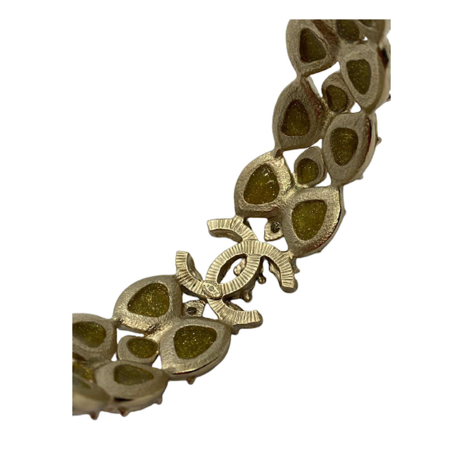 "okragła, złota, gruba bransoleta z kamieniami srebrnymi i żółtymi, w środku logo chanel, używana, przetarcia"