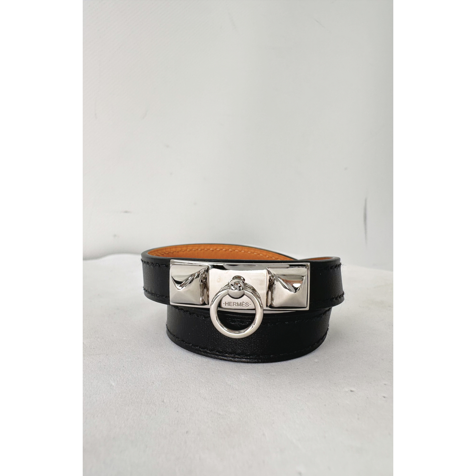 "Czarna skórzana podwójna bransoletka, srebrna ozdoba z logo marki w centralnej części, camelowe wnętrze, worek przeciwkurzowy oraz pudełko w komplecie. Model: Rivale Mini."