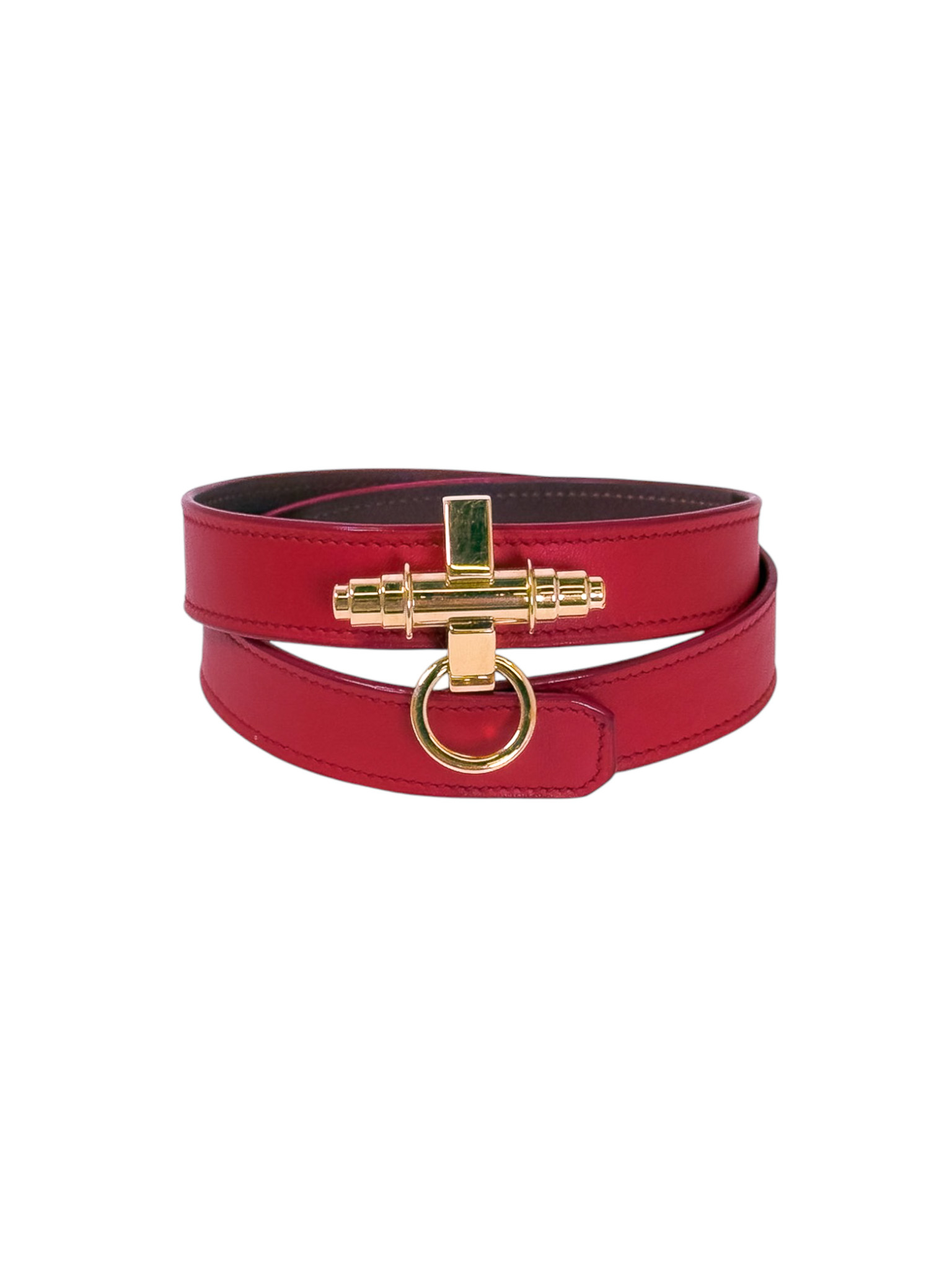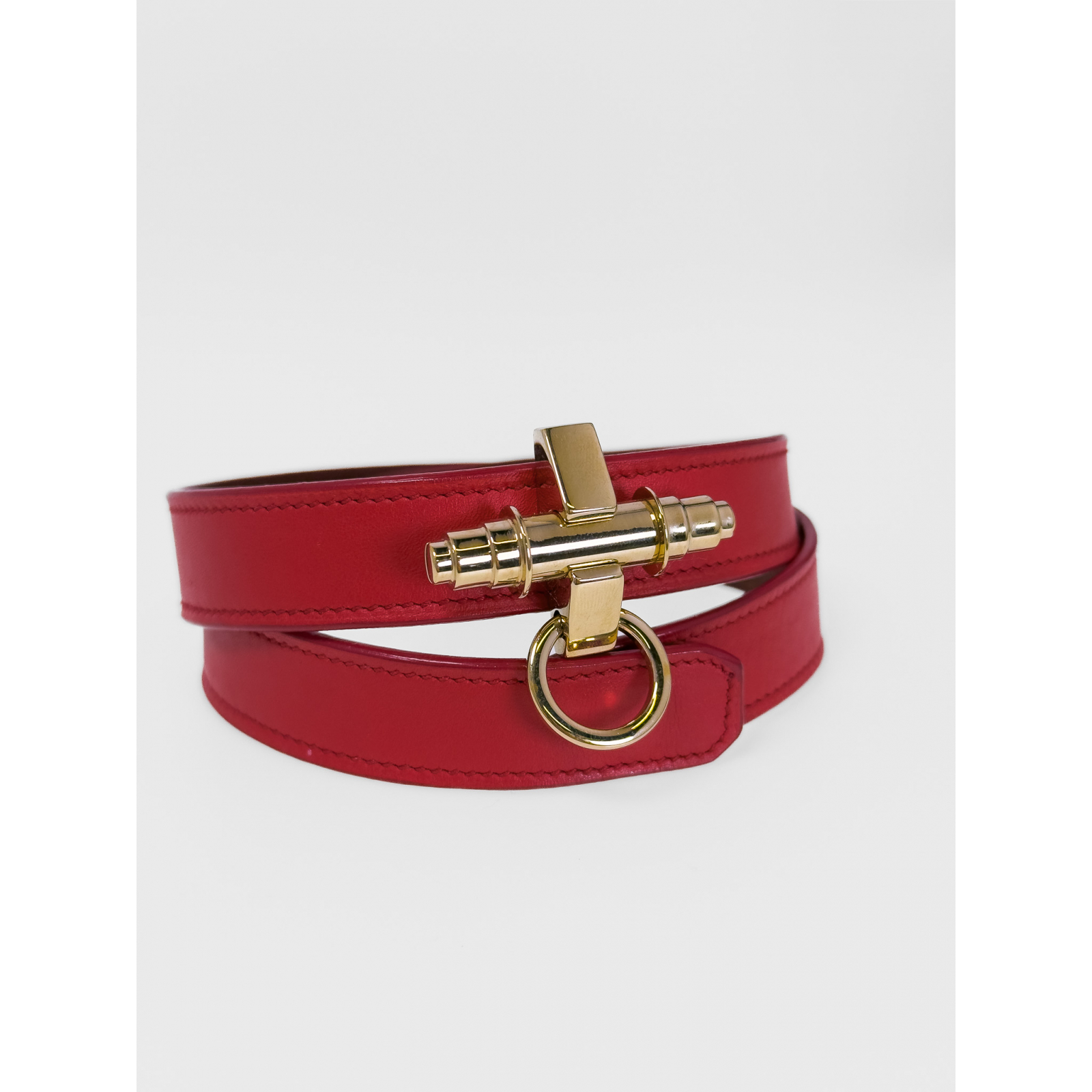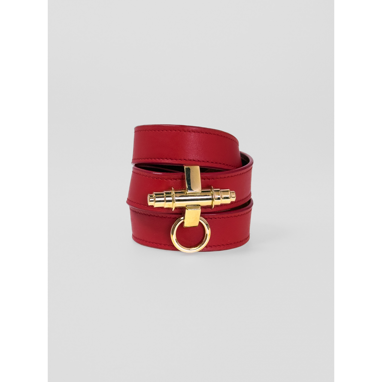 "Czerwona skórzana bransoletka, potrójna, gładka skóra, złota ozdoba wykończona okrągłą zawieszką w centralnej części, zapinana na złoty zatrzask, wytłaczane logo marki od wewnętrznej strony, w zestawie z pudełkiem."