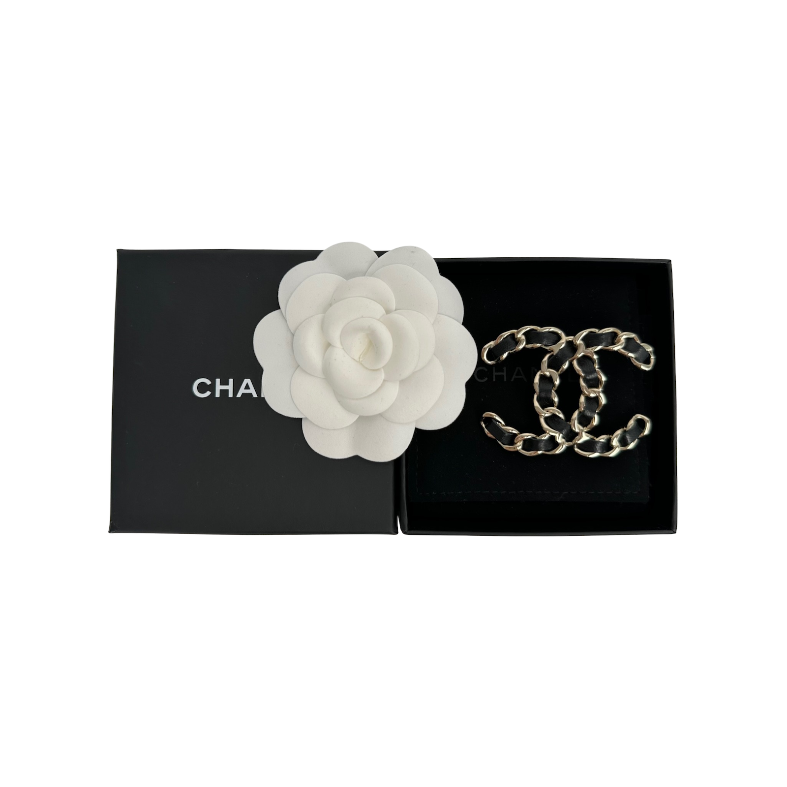 "broszka w kształcie loga chanel, złota przeplatana czarną skórą, w zestawie pudełko z kamelią."