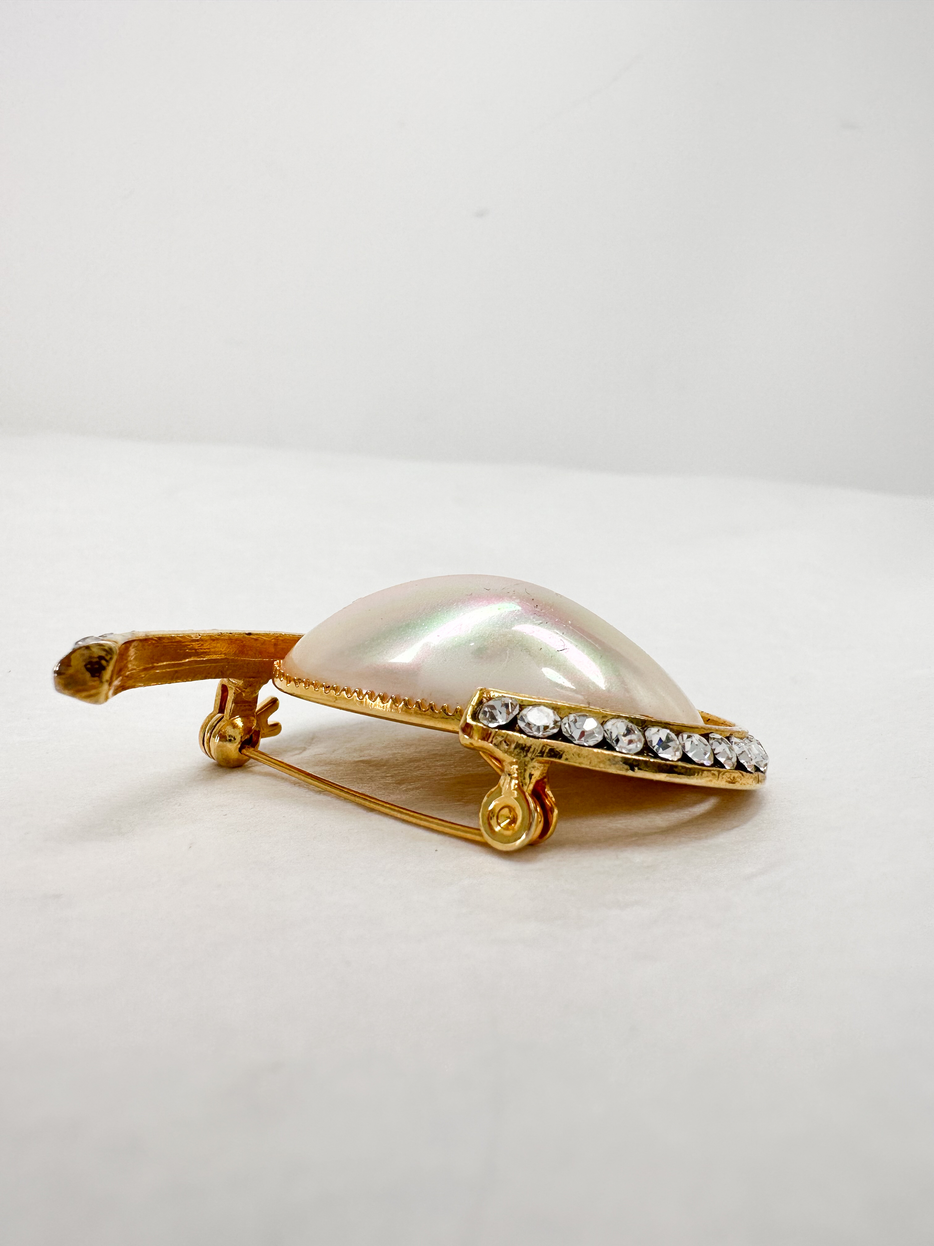 "Złota broszka ozdobiona dużą perłą, srebrne cyrkonie dookoła, długość 5cm."