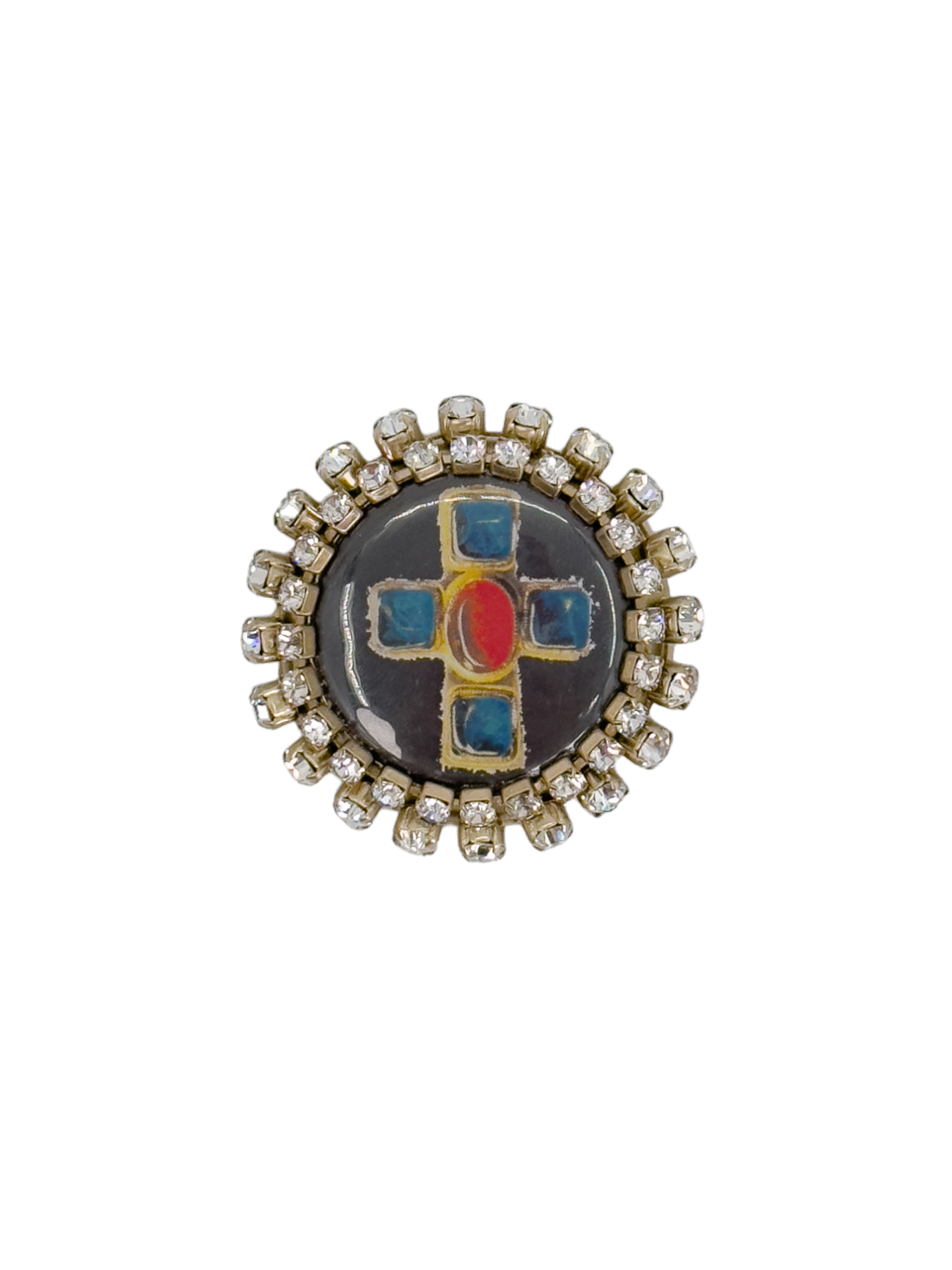 "Okrągła broszka z grafiką żółto-niebiesko-czerwonego krzyża na czarnym tle, wykończona błyszczącymi srebrnymi cyrkoniami różnej wielkości, złota od wewnętrznej strony. Wymiary: 5,5cm x 5,5cm."