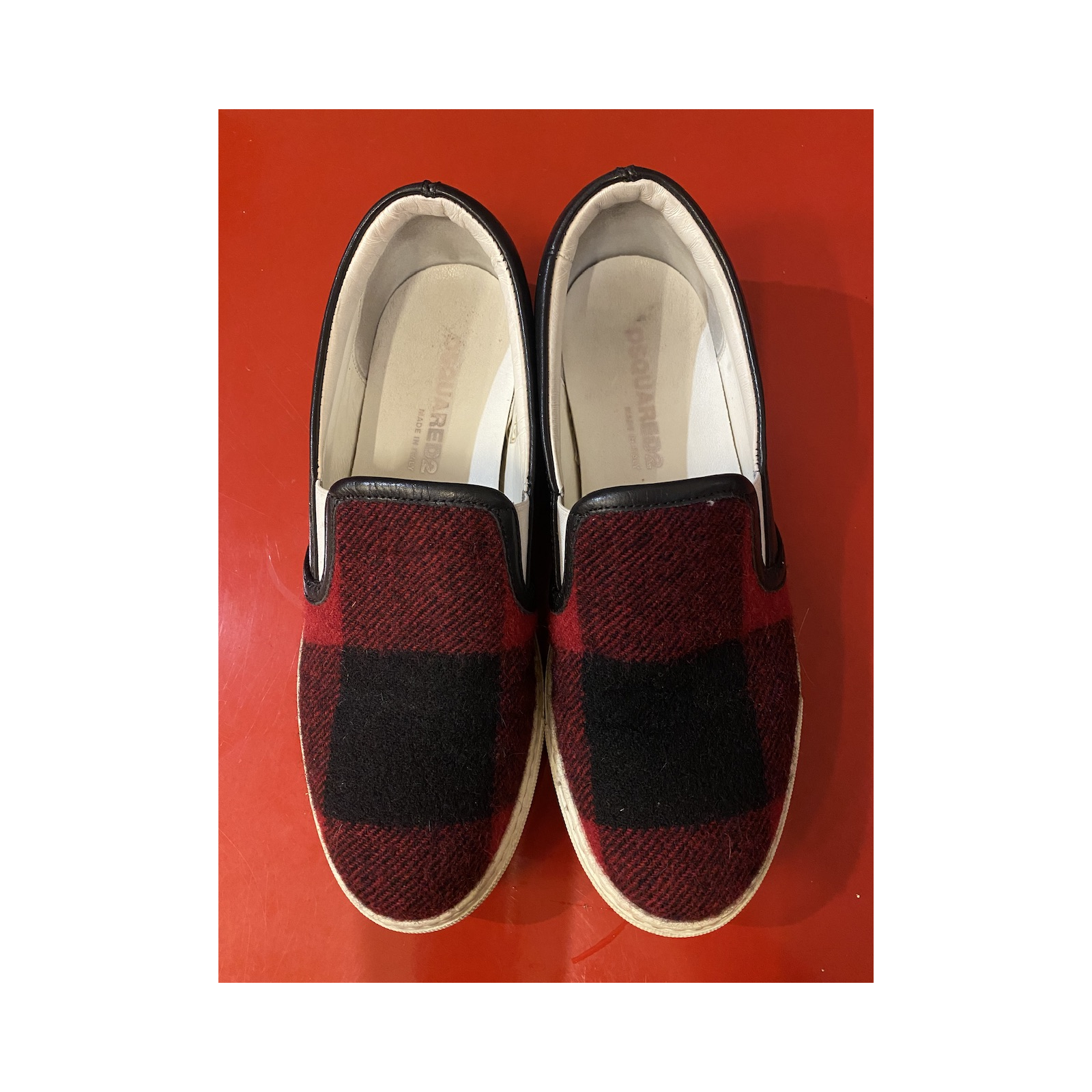"Buty Dsquared2 slip on, loafers. Skóra połączona z materiałem, wełna . W bardzo dobrym stanie . Jedynie podeszwa przybrudzona. Rozmiar 37."