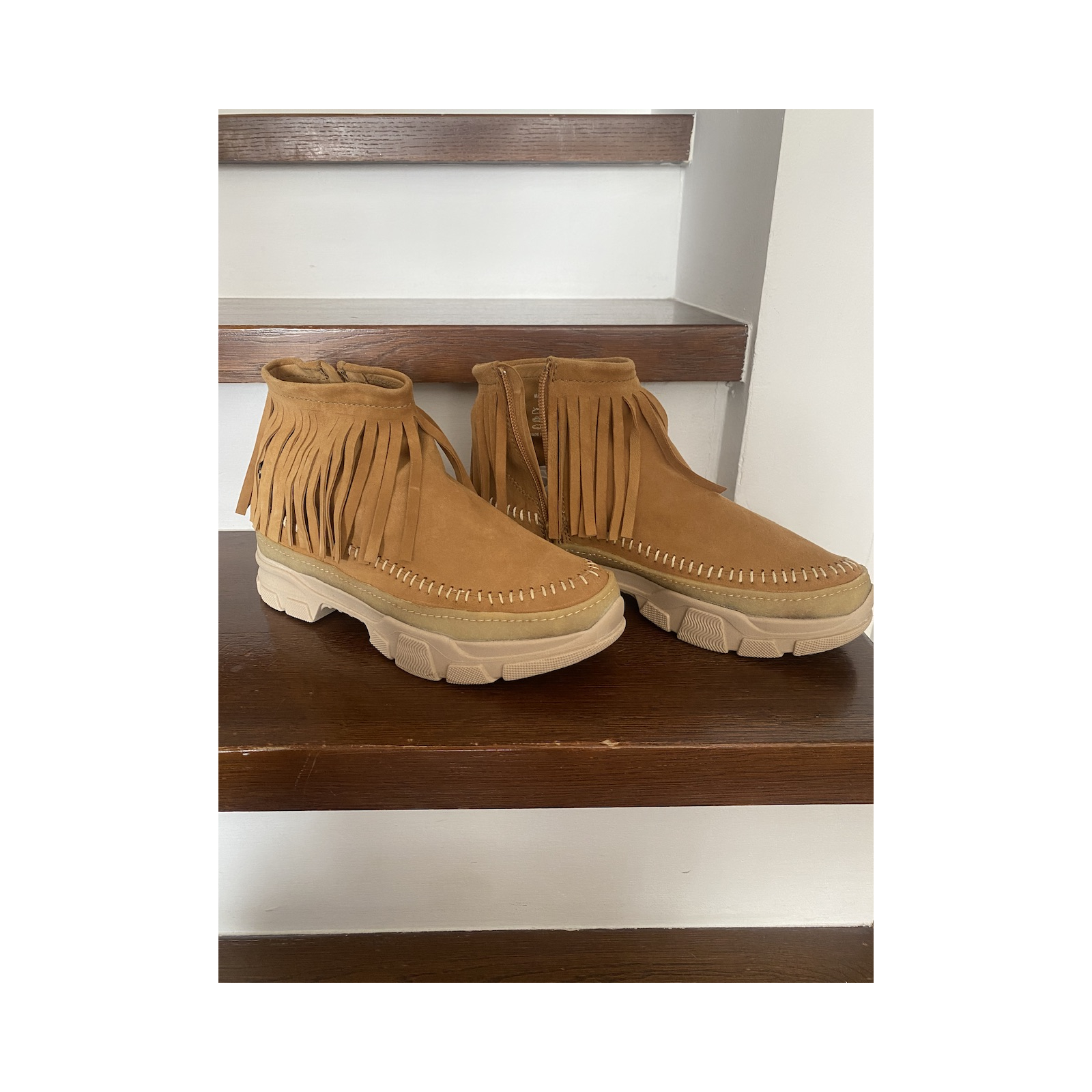 "Nowe buty z naturalnych materiałów, skórzane, wyściełane kożuszkiem . Bardzo lekkie. Ręcznie robione. Długość wkładki 23,5"