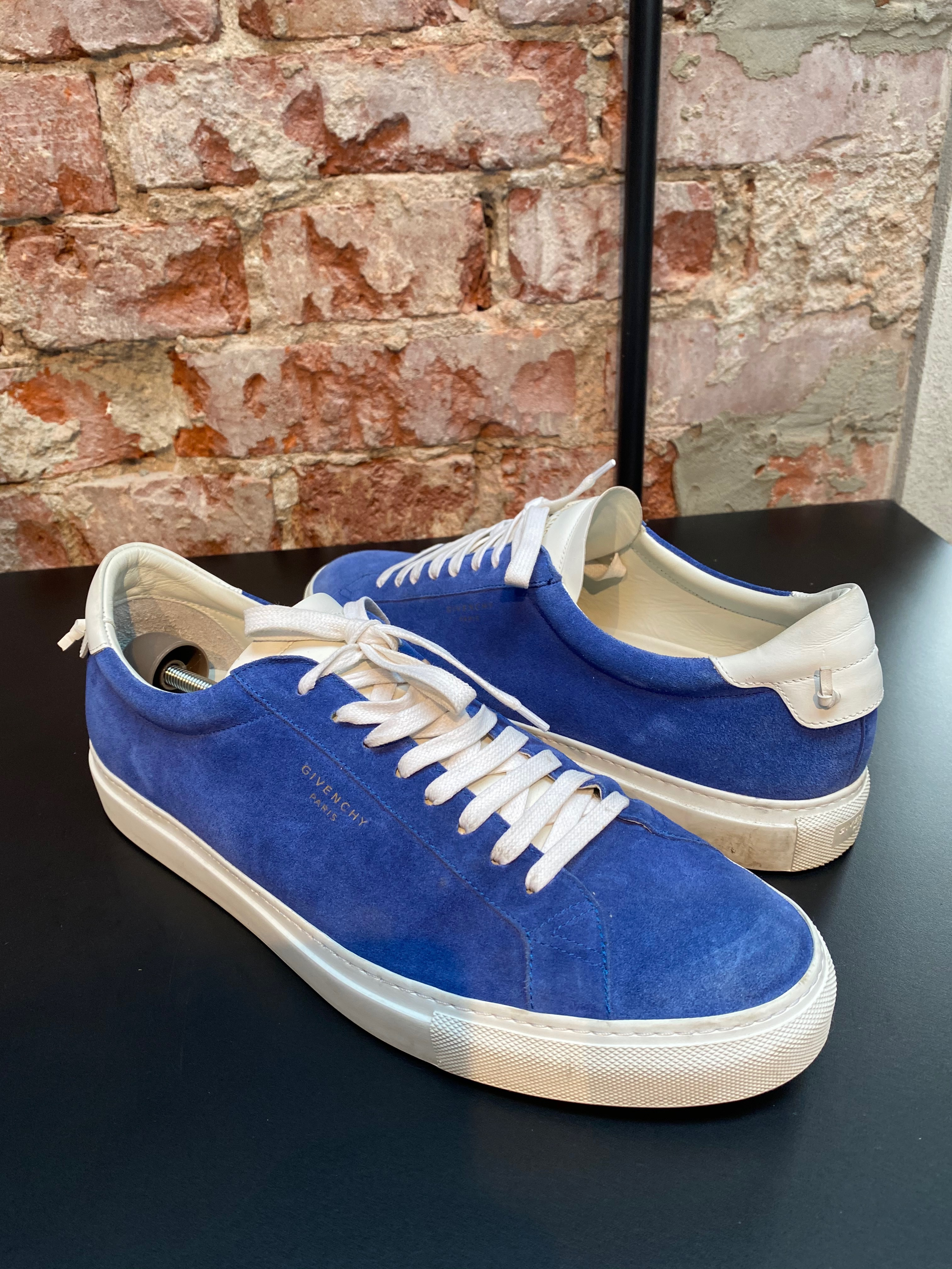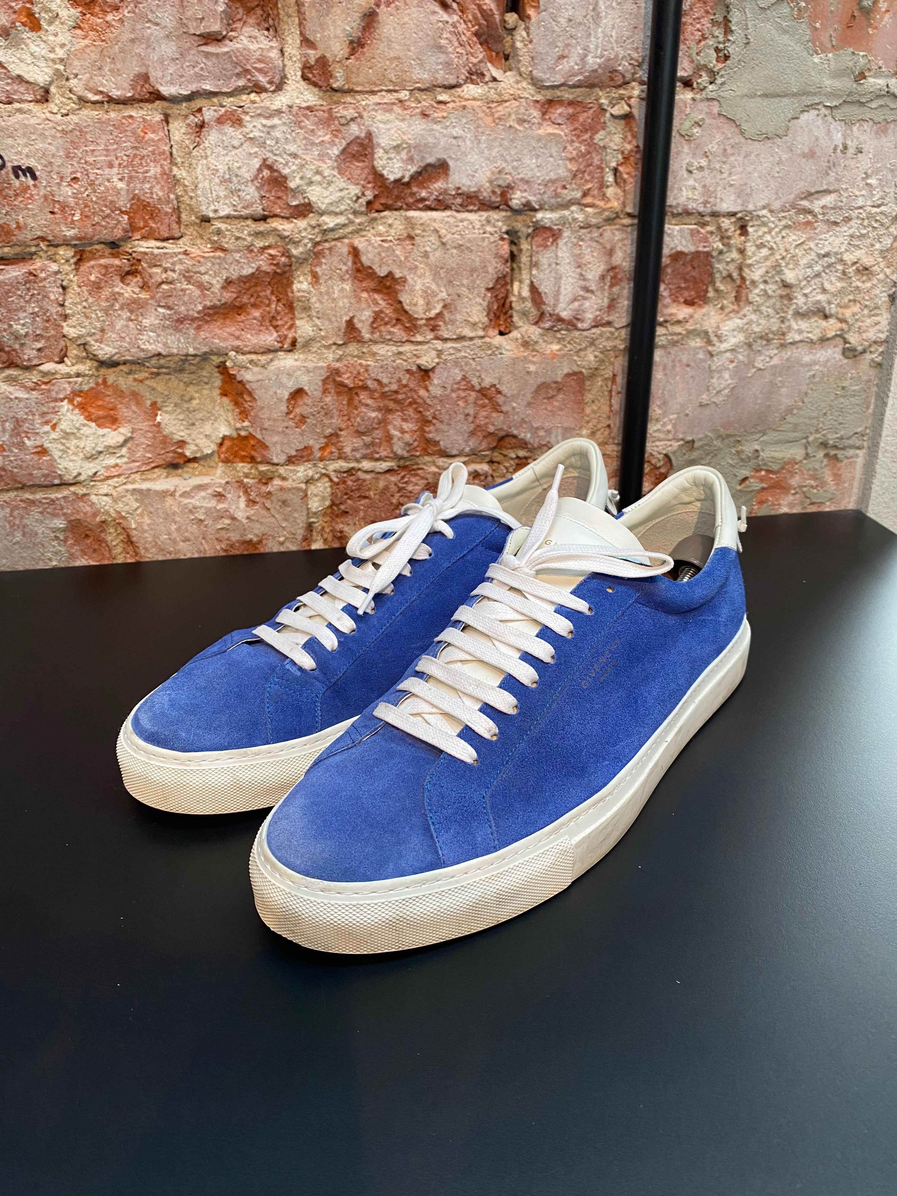"Niebieskie zamszowe buty, biała podeszwa/sznurówki, pięta, rozmiar 45"