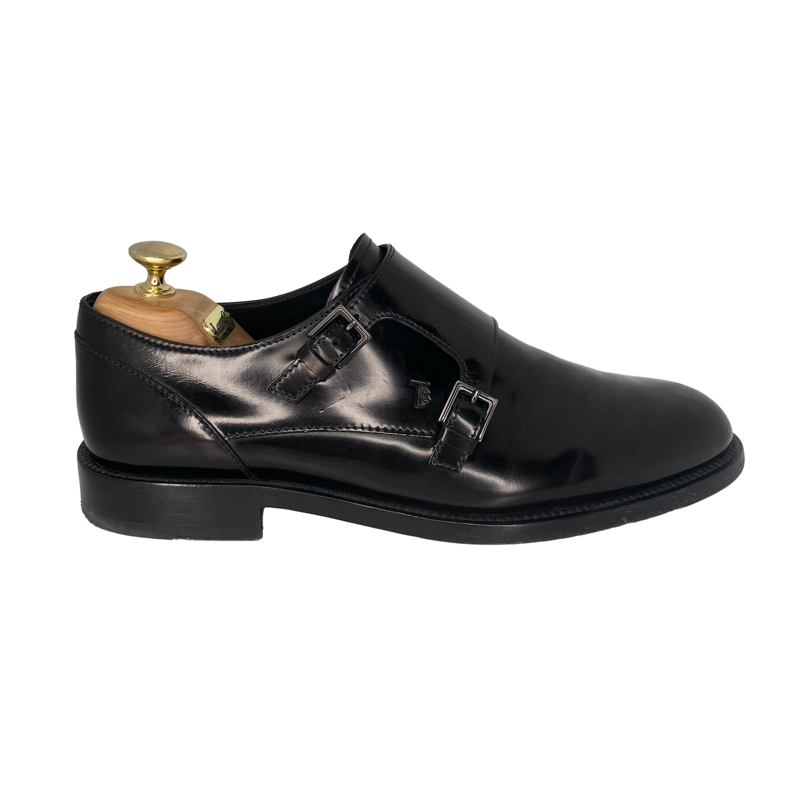 "czarne lakierowane mokasyny, z przodu dwie czarne sprzączki. W zestawie pudełko i drewniane prawidła. Używane, stan bardzo dobry. Rozmiar 7,5."