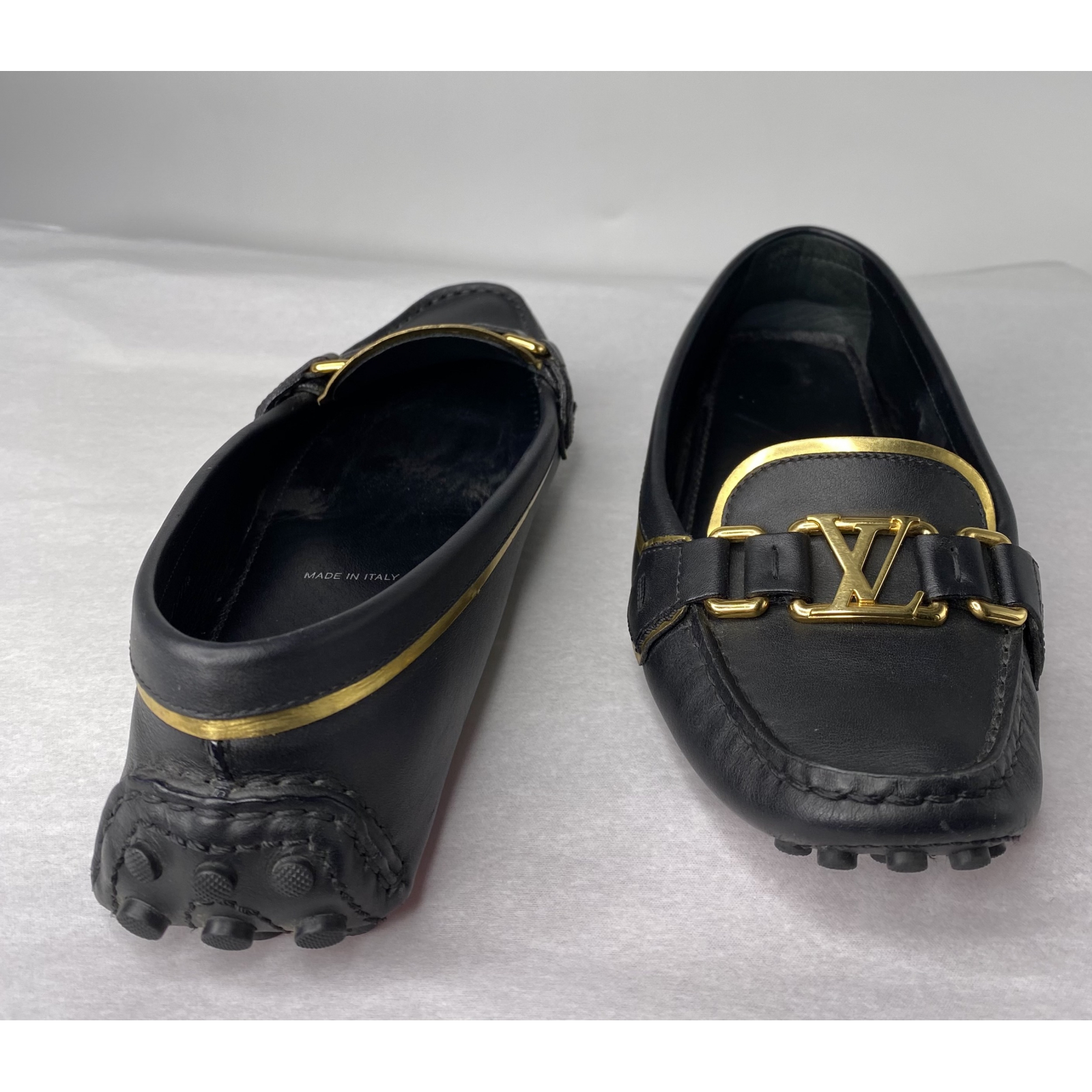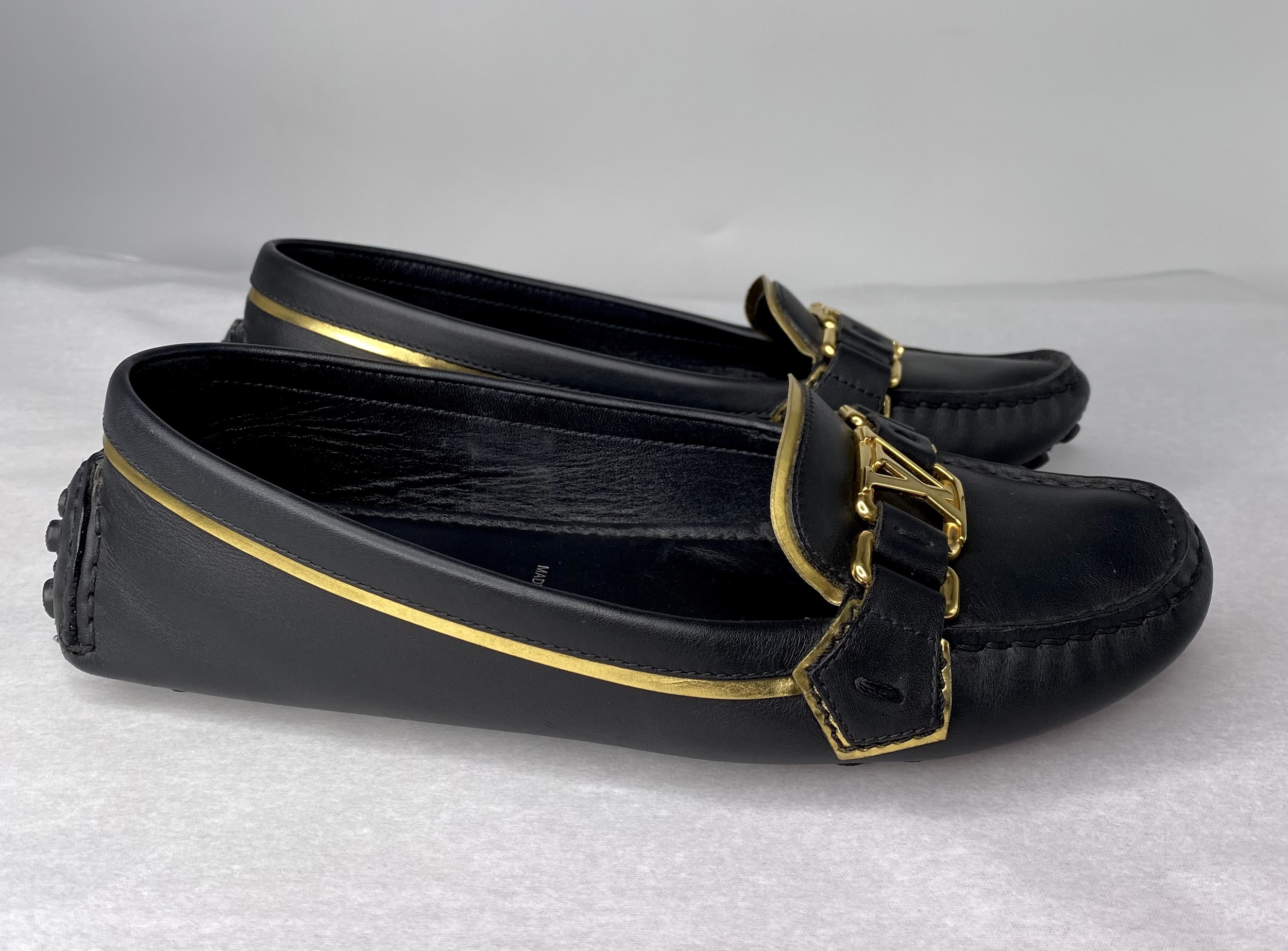 "klasyczne, czarne mokasyny ozdobione złotą lamówką, na przodzie złota klamra z logo LV, używane, widoczne przetarcie na pięcie, pudełko. Rozmiar 36."