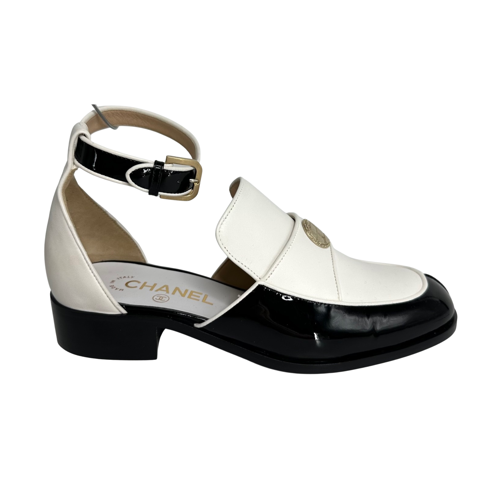 "biało-czarne skórzane buty loefersy, pasek z klamrą wokół kostki, złota okrągła blaszka na przodzie, nowe, pudełko w zestawie. Rozmiar 38."