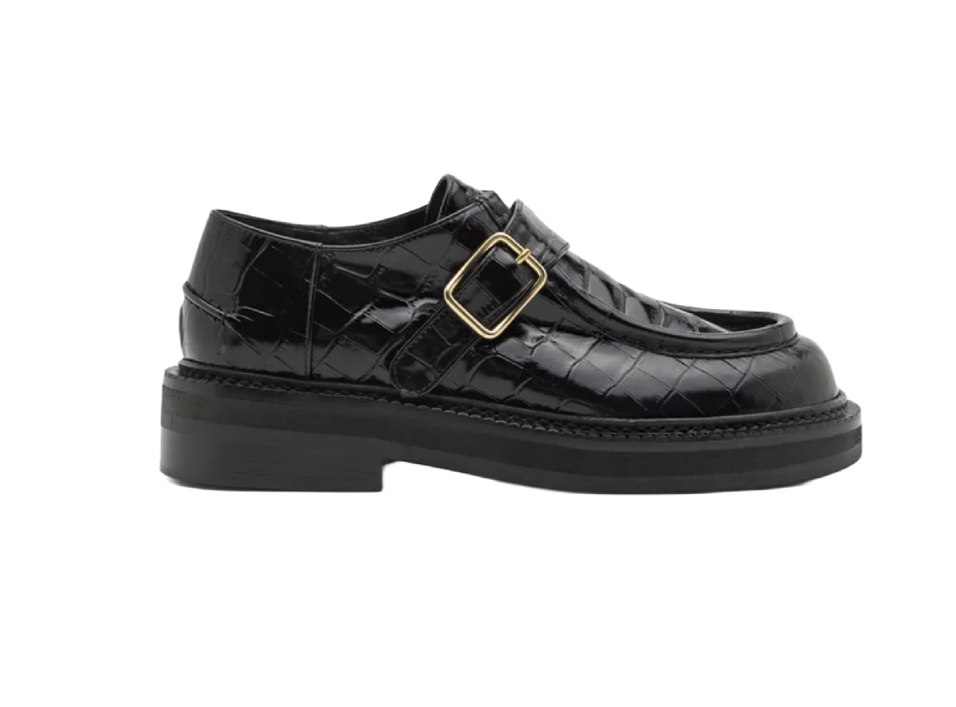 "Czarne, skórzane mokasyny w wytłaczany wzór skóry krokodyla, zapinane na złotą sprzączkę, na gumowej podeszwie. Rozmiar 36. Wypadają na rozmiar 37. Używane."
