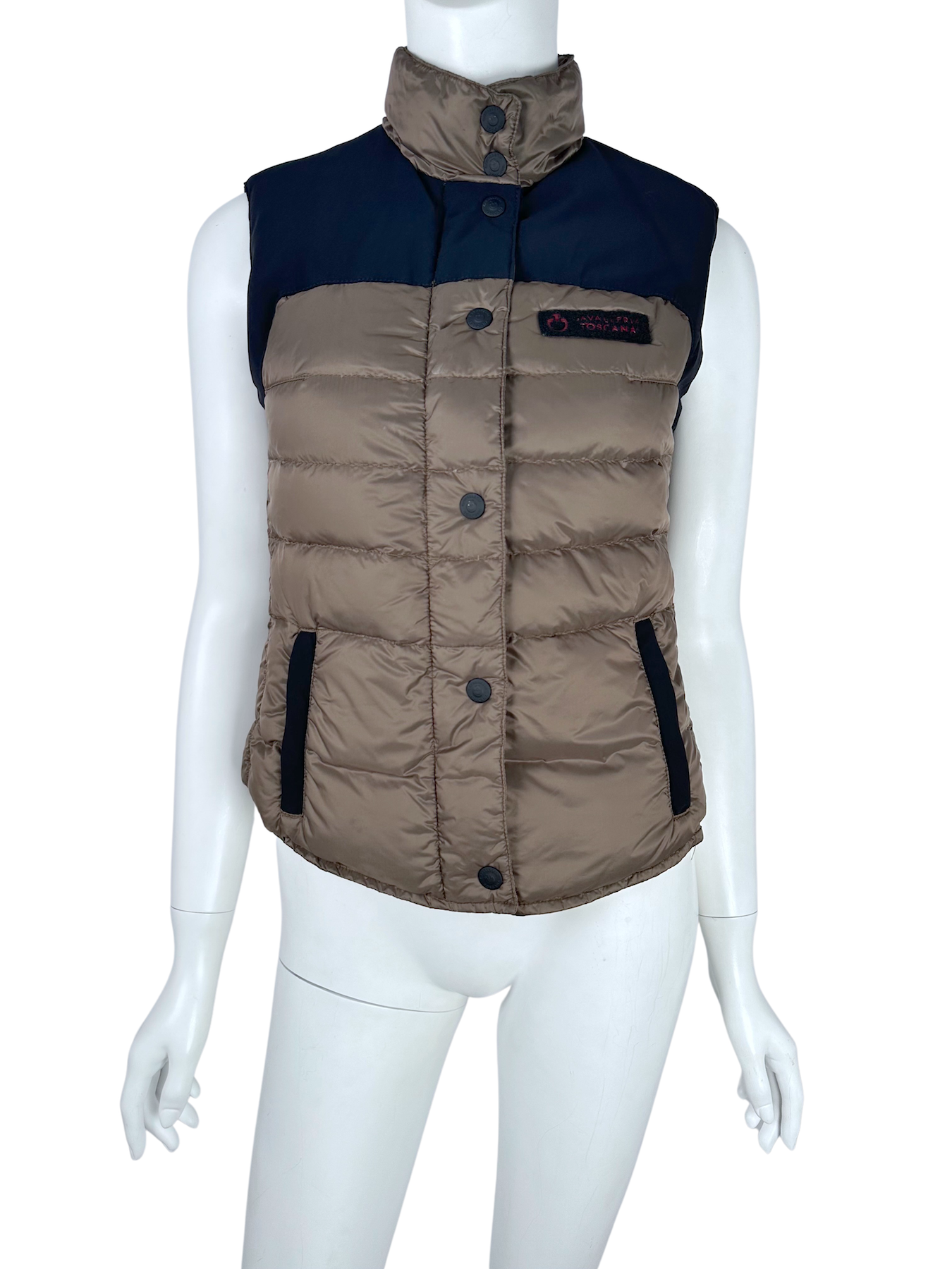 "Kamizelka w kolorze khaki z czarnymi wstawkami, bez rękawów, zapinana z przodu na suwak i zatrzaski, boczne kieszenie z suwakami, naszywka z logiem na piersi. Rozmiar S. Skład: 100% puch."