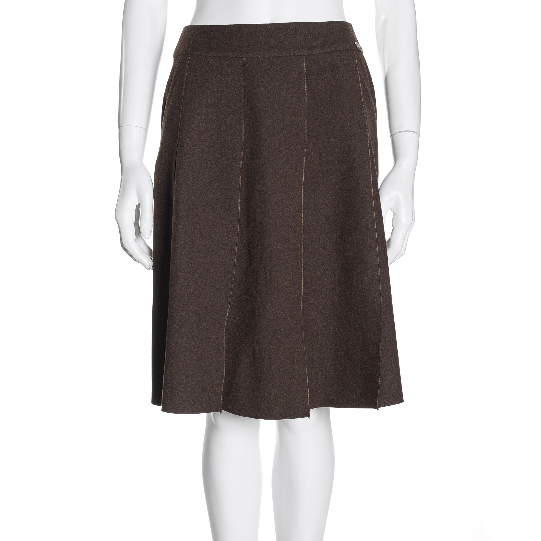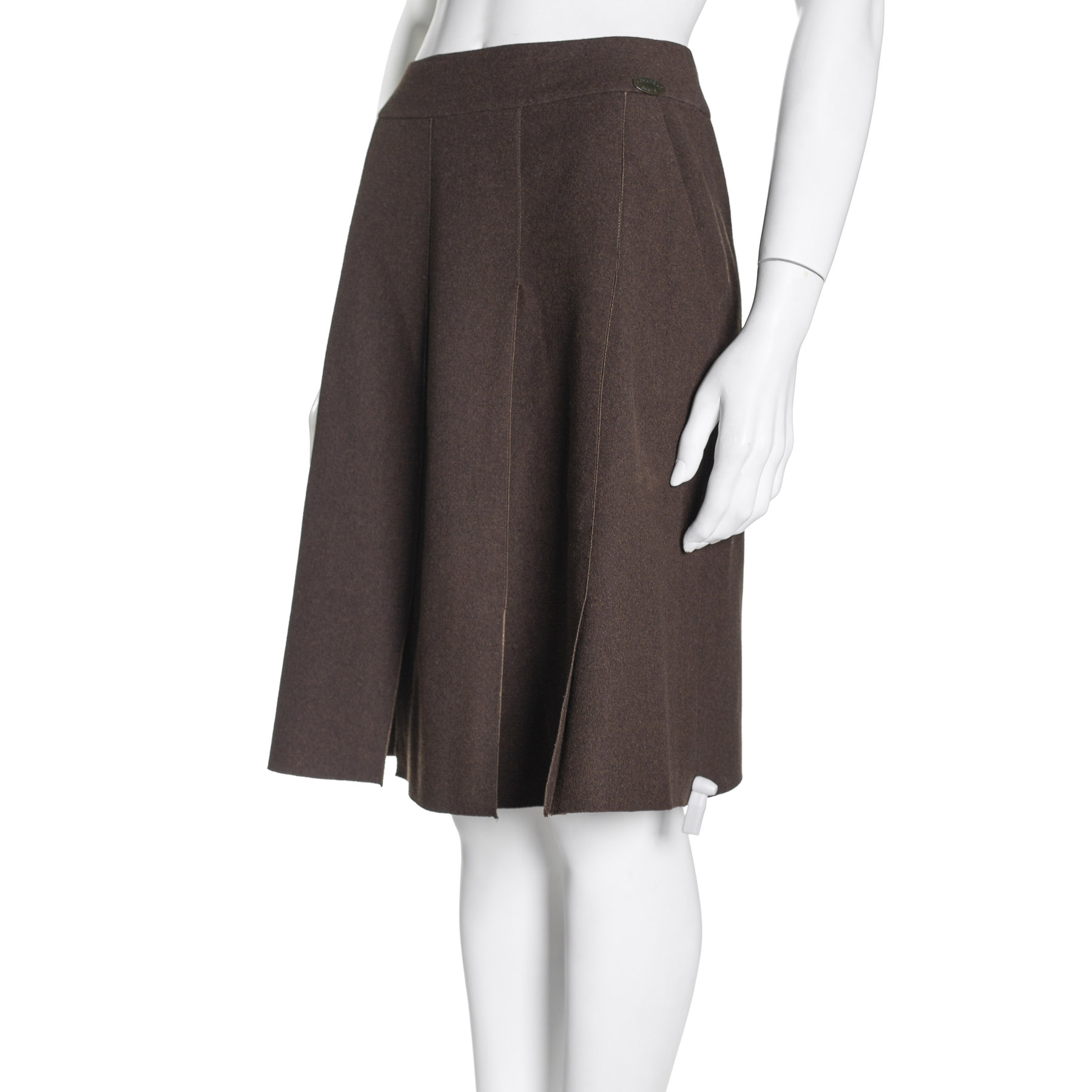 "Spódnica brązowa wełniana, rozmiar z metki 38, z lewej strony na biodrze blaszka z napisem "CHANEL PARIS" kieszenie po bolach, z przodu rozcięcia w miejscu przeszyć. Wymiary: szerokość w pasie 34 cm długość 93 cm."