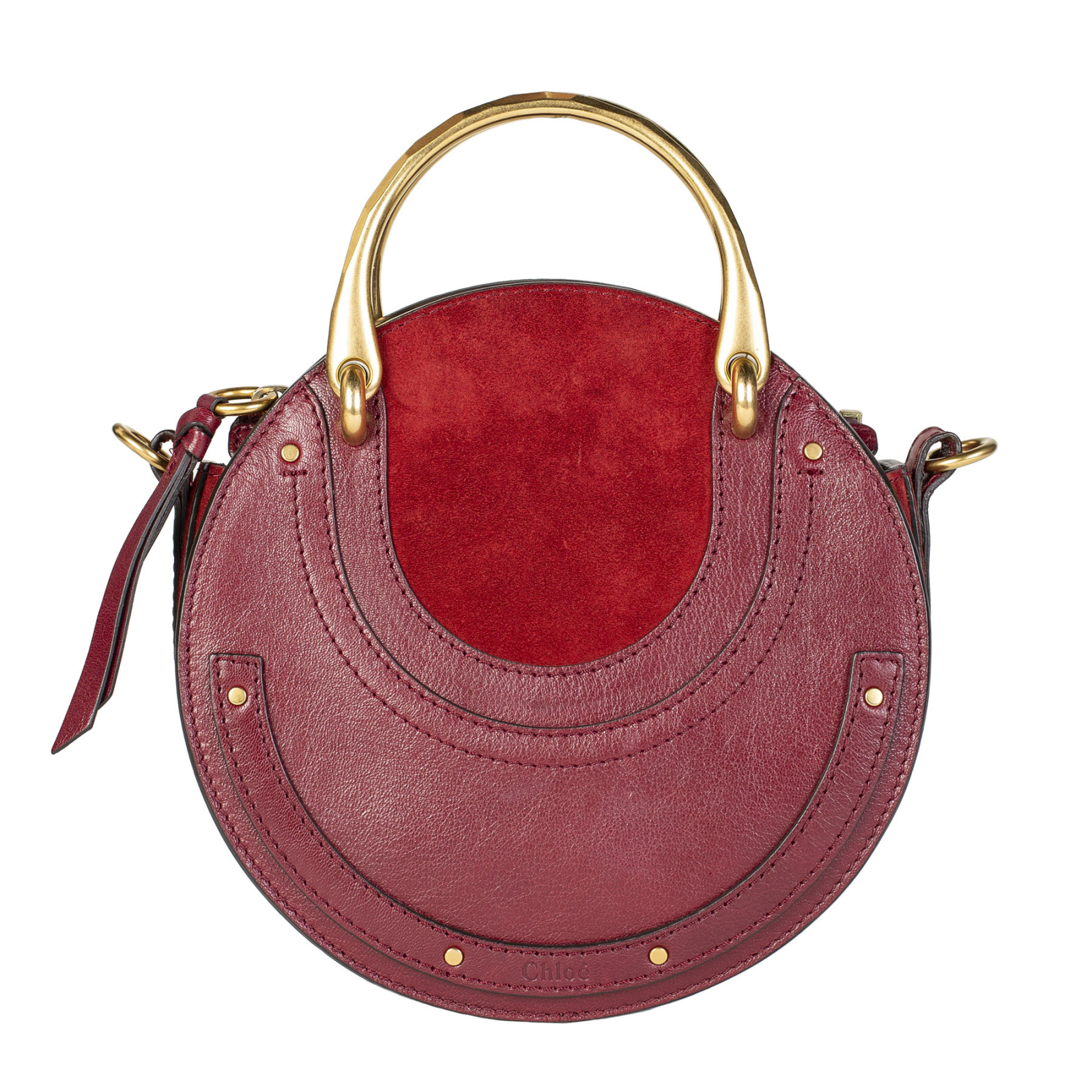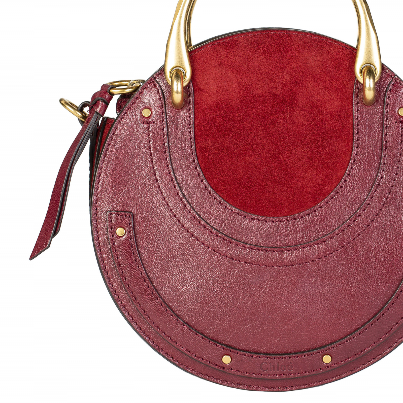 "Chloe bordowa okrągła torebka, skóra + zamsz, długi cienki pasek, złote elementy. Pixie textured-leather and suede shoulder bag. Cena oryginalna £1,055, uszkodzony suwak nie wpływający na użytkowanie. Średnica torebki 21 cm. Regulowana długość paska."