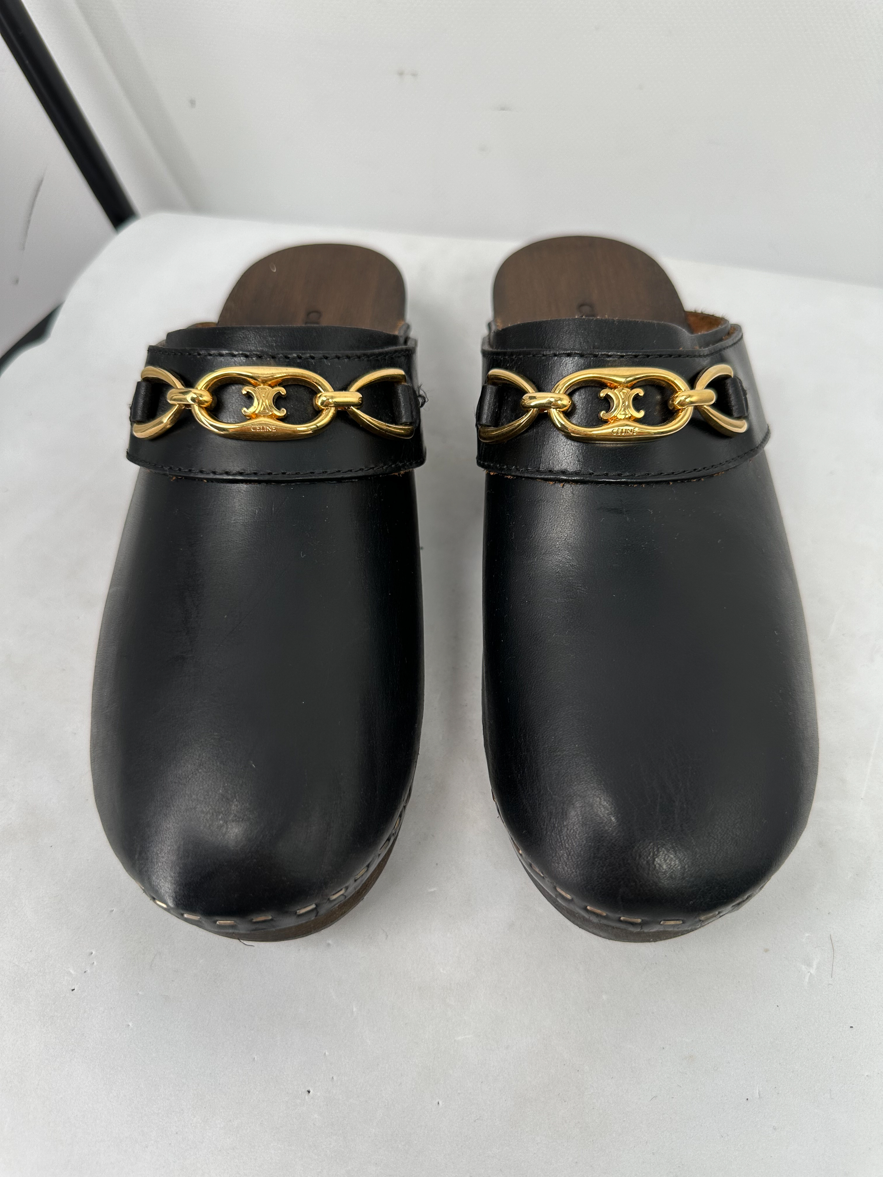 "Czarne skórzane chodaki ozdobione złotą sprzączką z logo marki, ciemnobrązowa drewniana podeszwa, niski obcas, odkryta pięta, zaokrąglone noski, używane. Stan bardzo dobry, delikatnie odklejona podeszwa lewego buta w okolicy obcasa oraz przetarcia na skórze. Rozmiar 38."