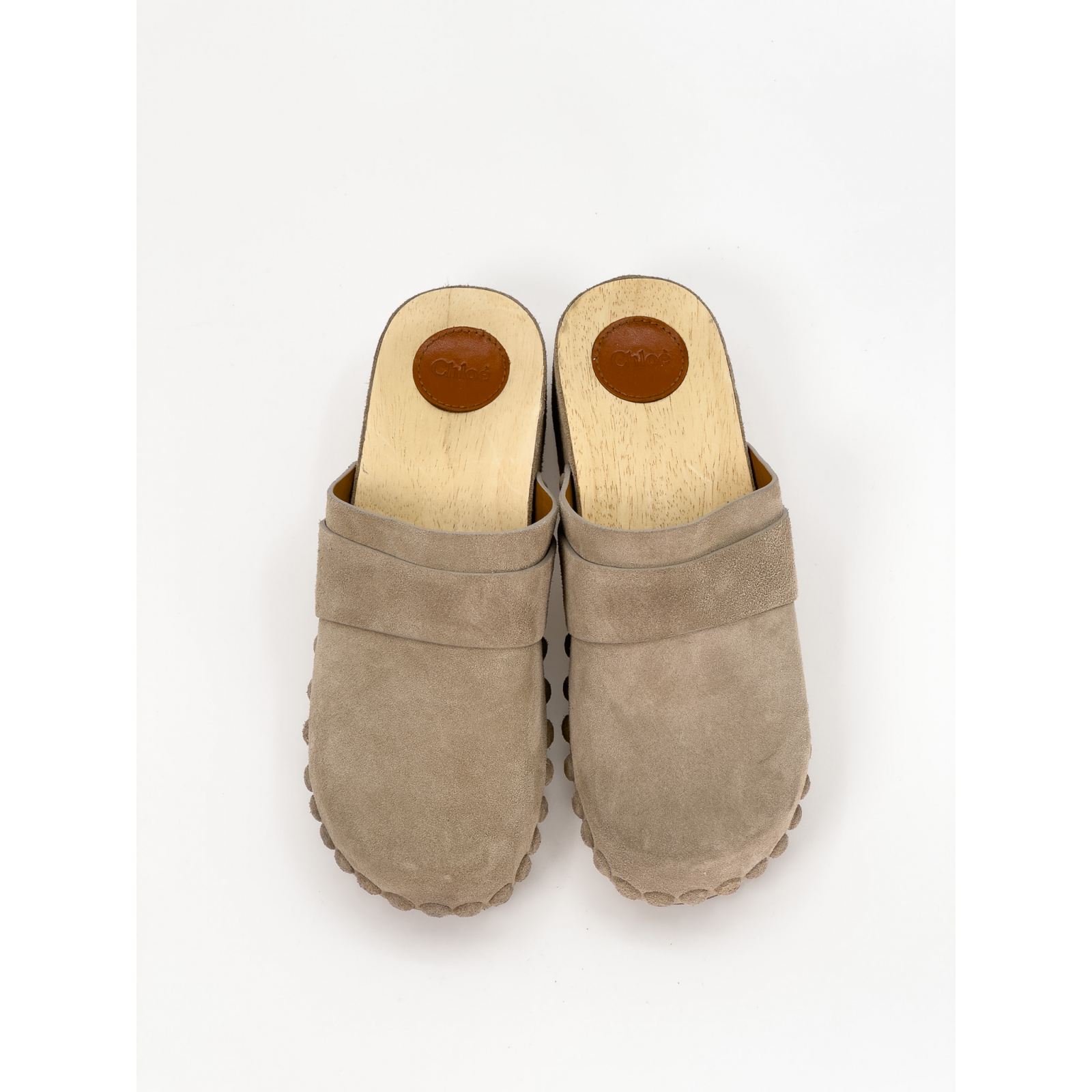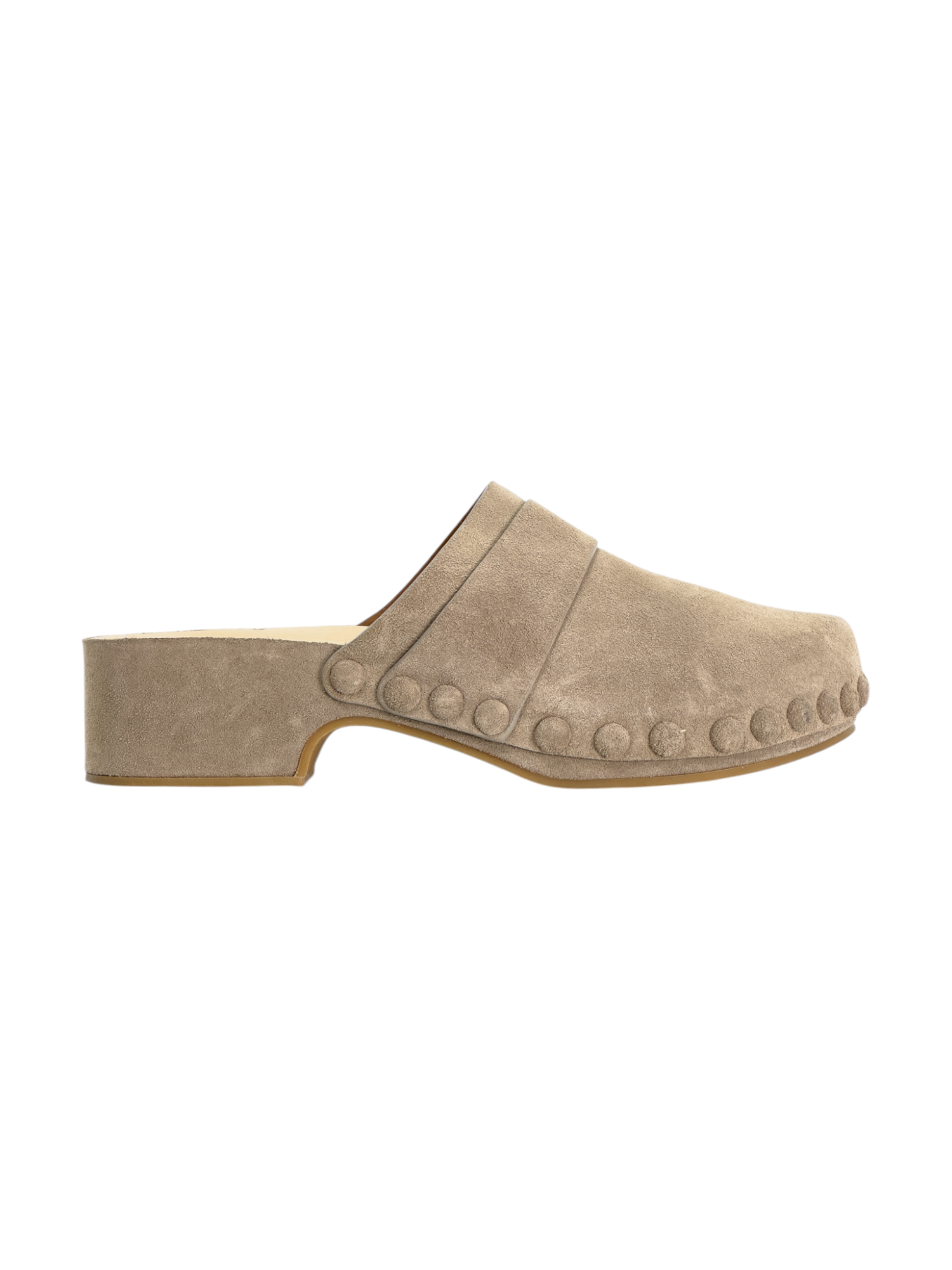 "Szare zamszowe chodaki, zaokrąglone noski z okrągłymi dżetami, pasek w przedniej części, niski obcas, drewniana wkładka, skórzane wnętrze, gumowa podeszwa. Stan idealny. Rozmiar 39."