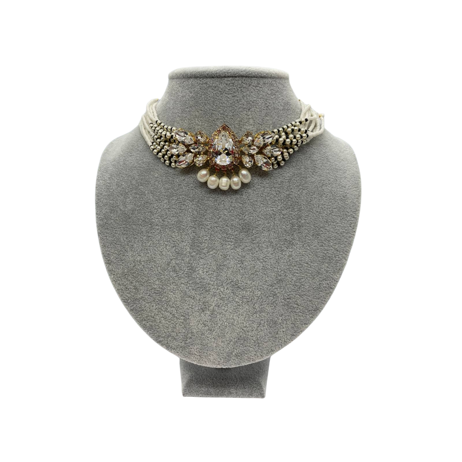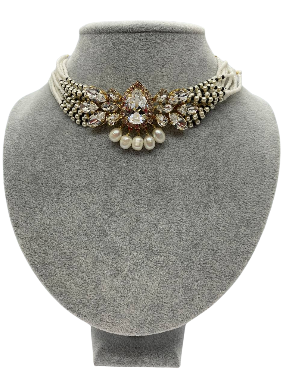"choker na złotym łańcuszku, wykonany z czarno-białych i perłowych koralików, na przodzie duża aplikacja z kryształków