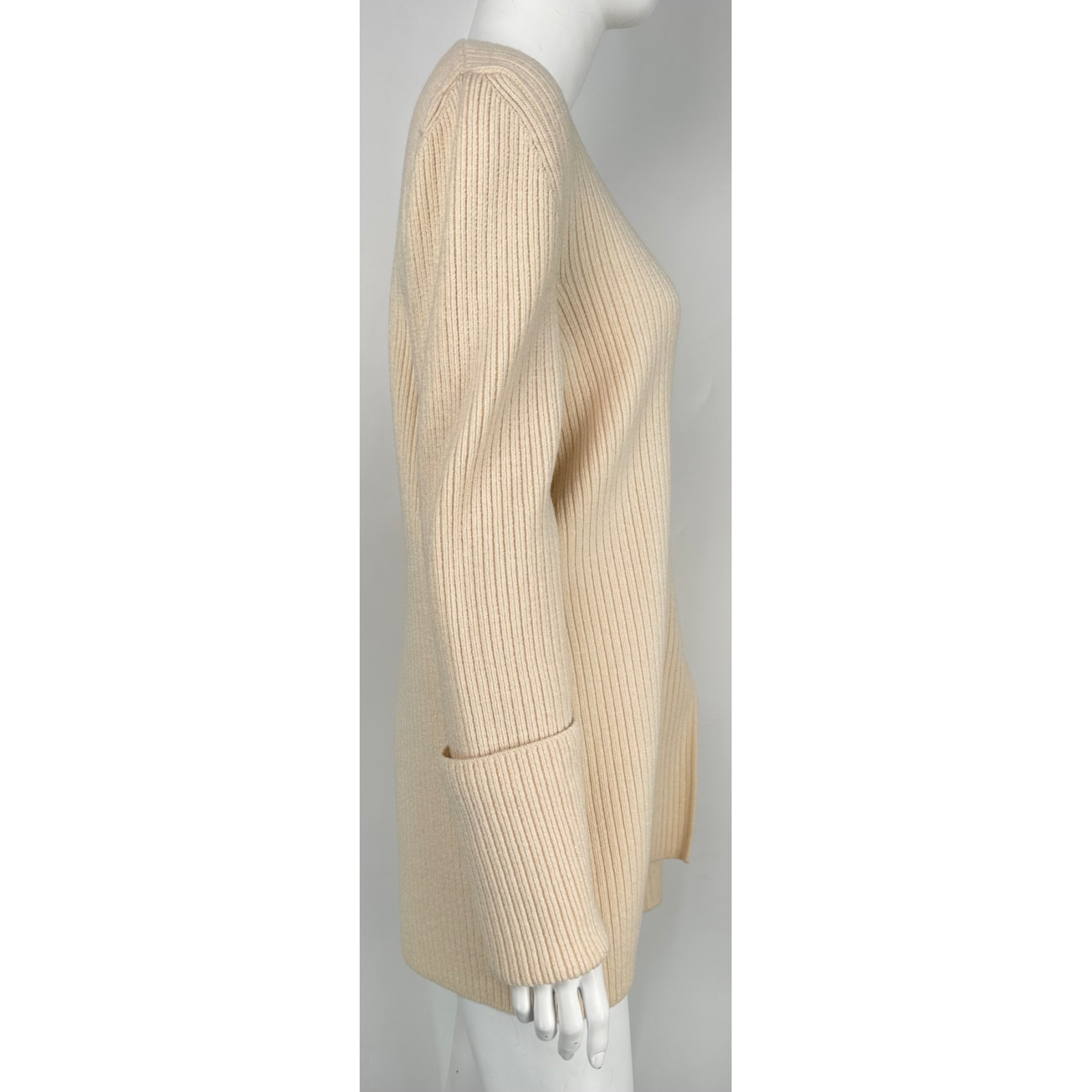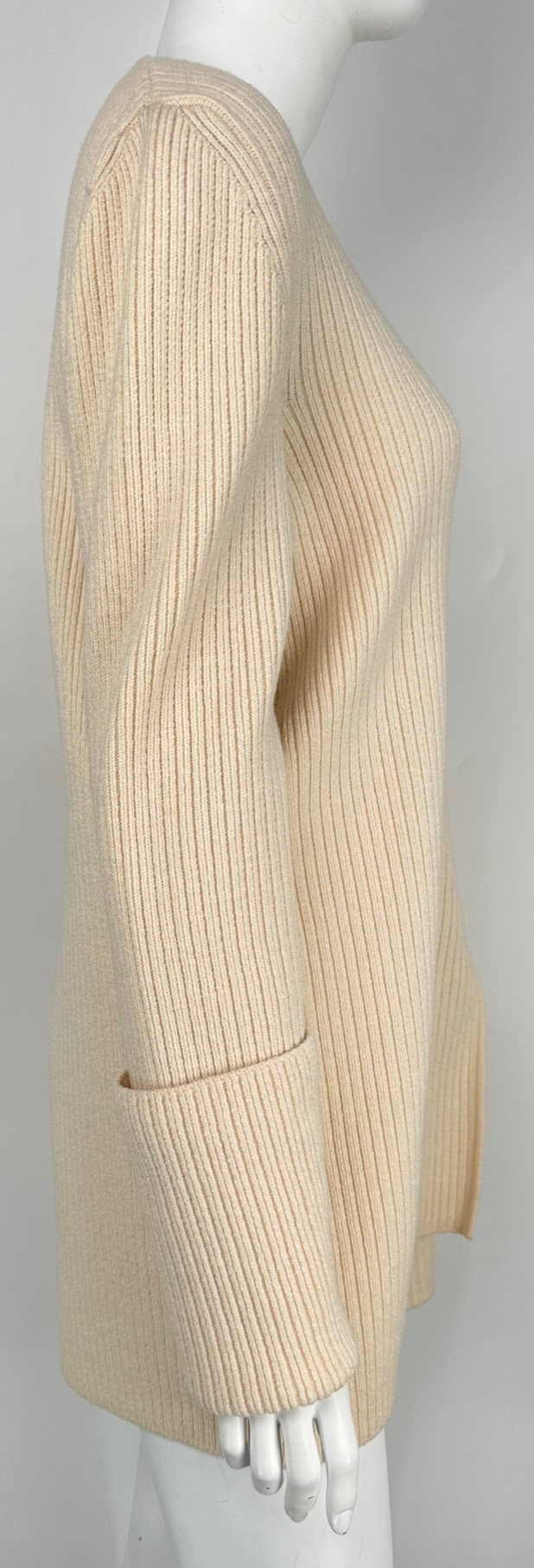"sweter w kolorze ecru, zapinany na suwak znajdujący się lekko z lewej ( nie na środku), długi rękaw. Rozmiar IT 42. Skład: 70% virgin wool, 15% poliester, 15% poliamid. Wymiary: rękaw długość od ramienia 61 cm, długość 76cm , szerokość pod pachami 50 cm."