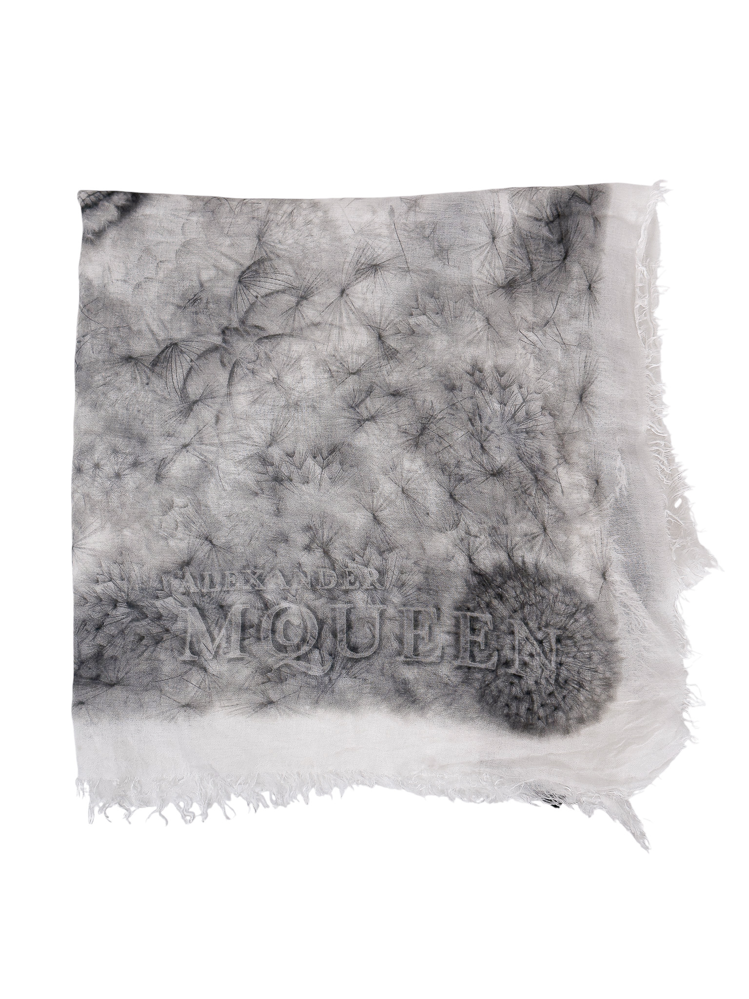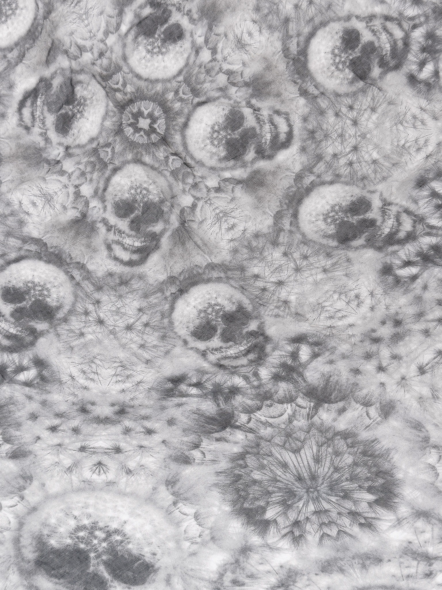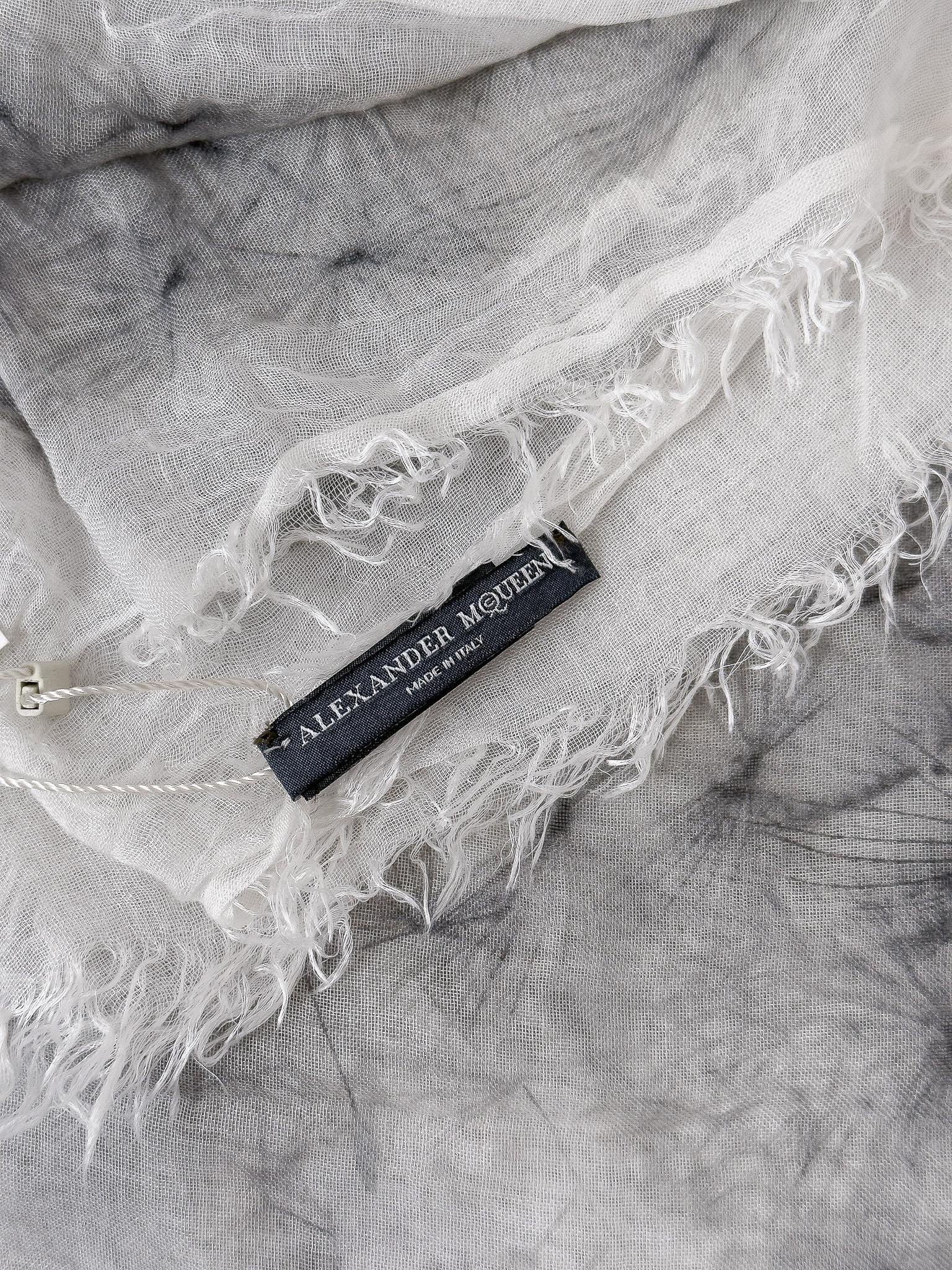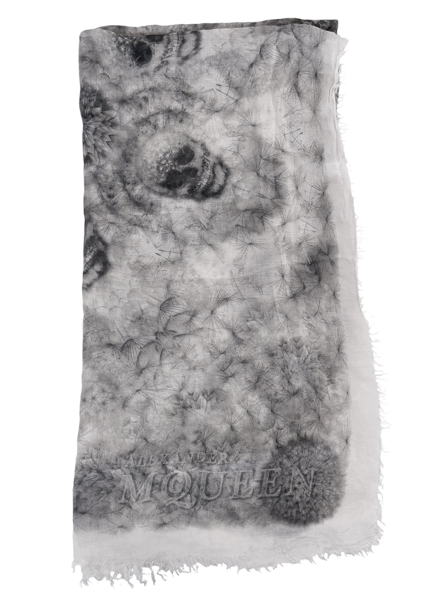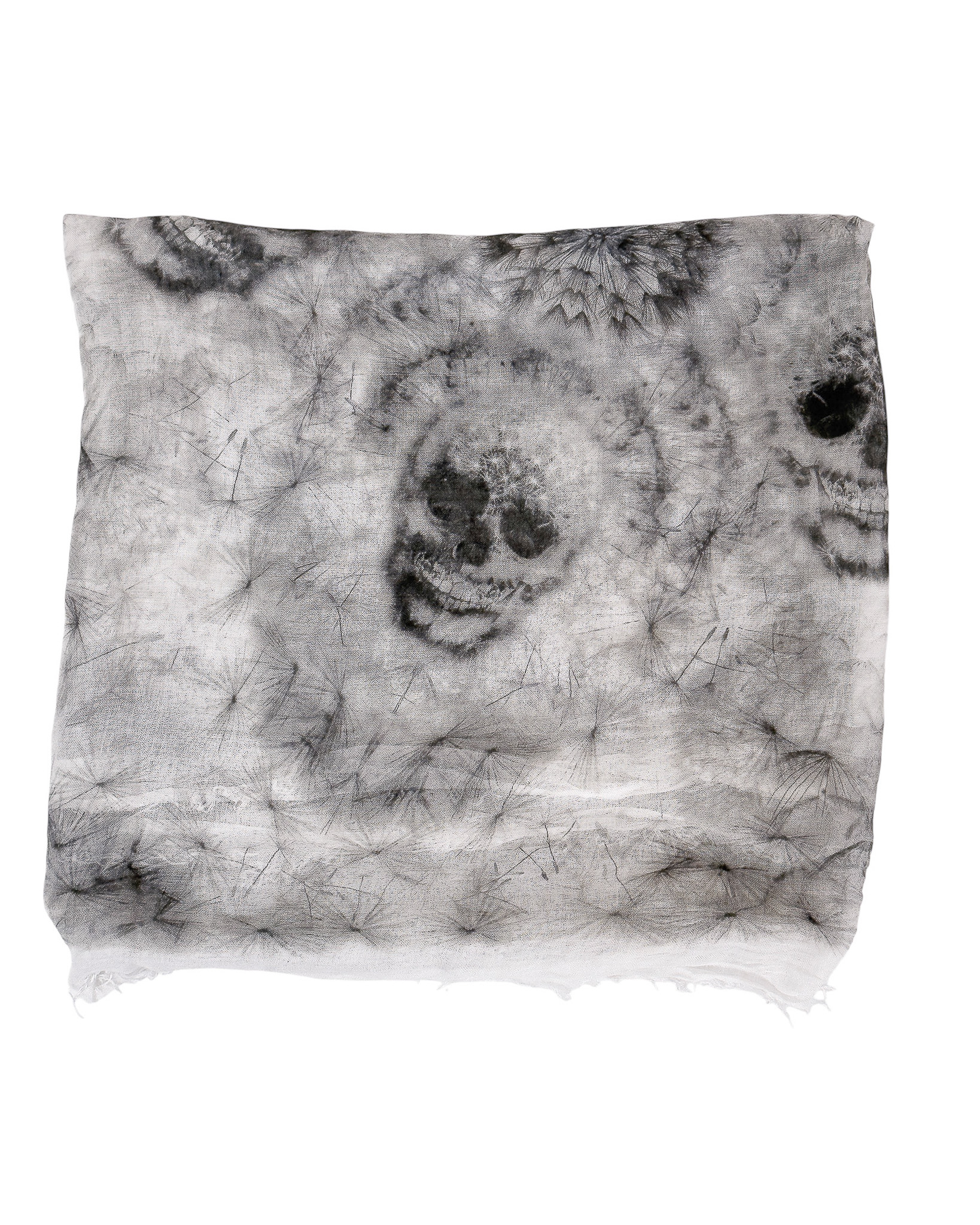 "Biało-szara chusta w grafitową grafikę z czaszkami i łańcuchami. Skład: 90% modal, 10% kaszmir. Stan bardzo dobry. Wymiary: 134cm x 135cm."