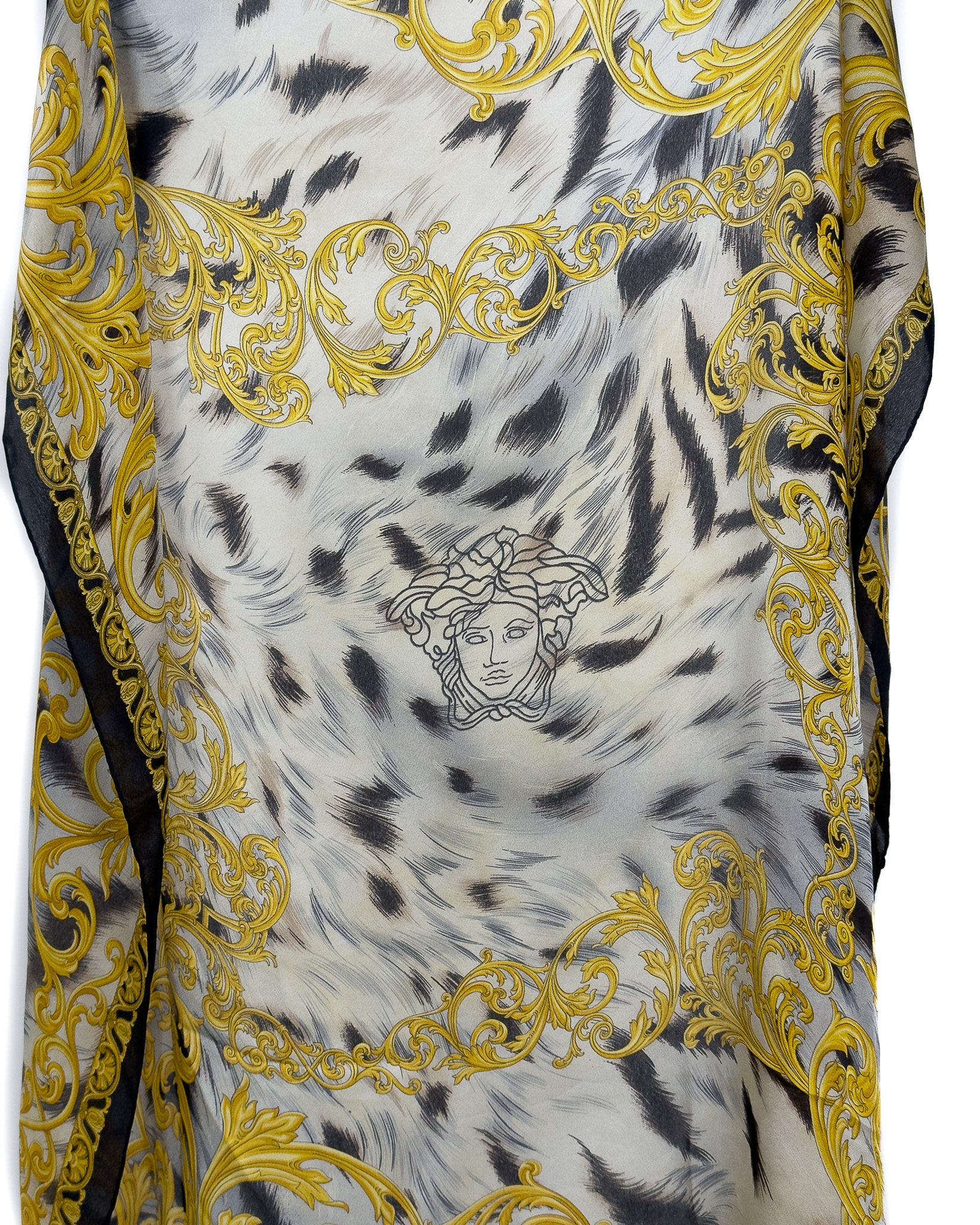"Biała jedwabna chusta w print zwierzęcy, w motyw białej pantery, ozdobiona złotym wzorem oraz grafiką charakterystyczną dla marki w centralnej części, kwadratowy kształt, czarna lamówka. Stan bardzo dobry. Skład: 100% jedwab. Wymiary: 88cm x 85cm."