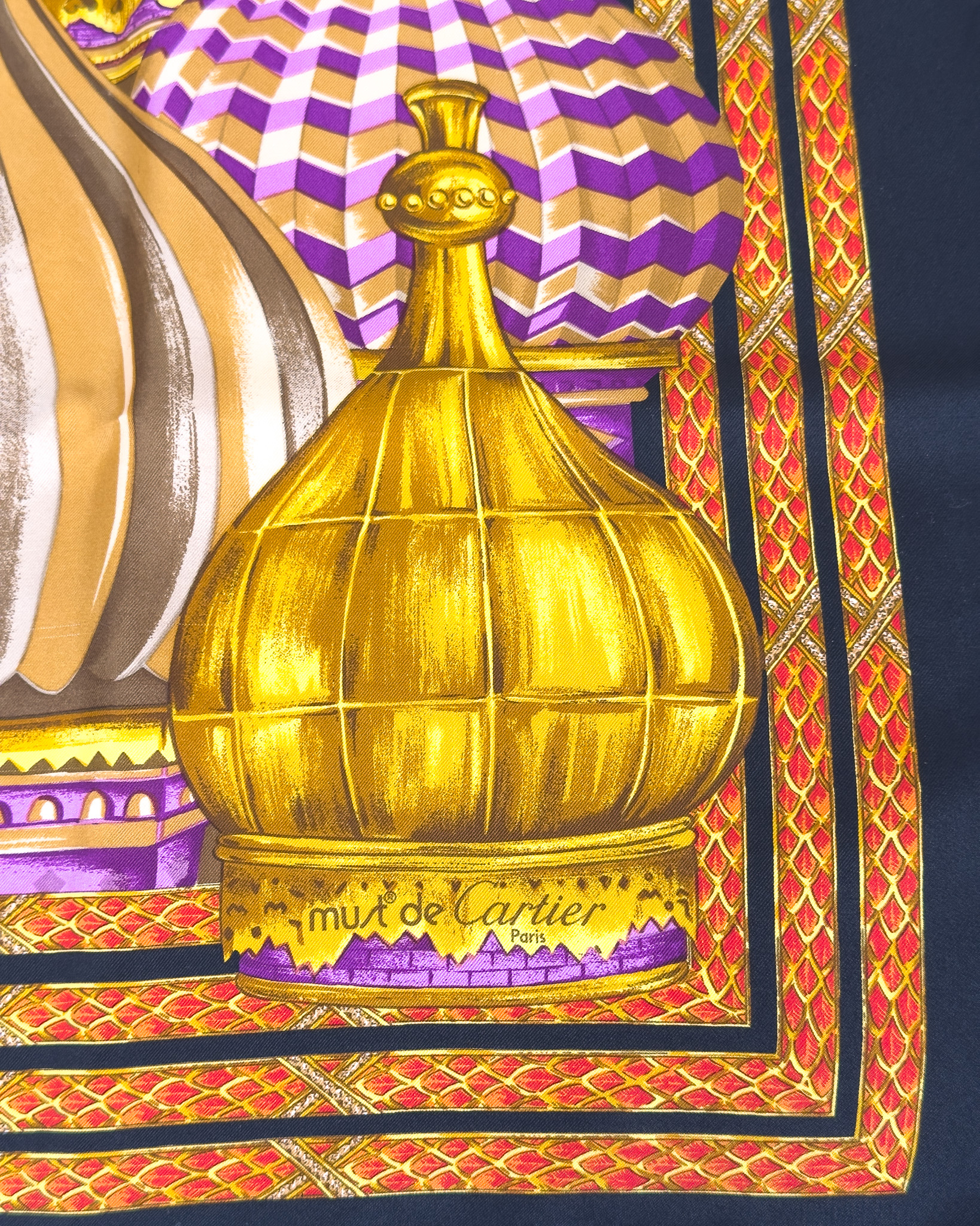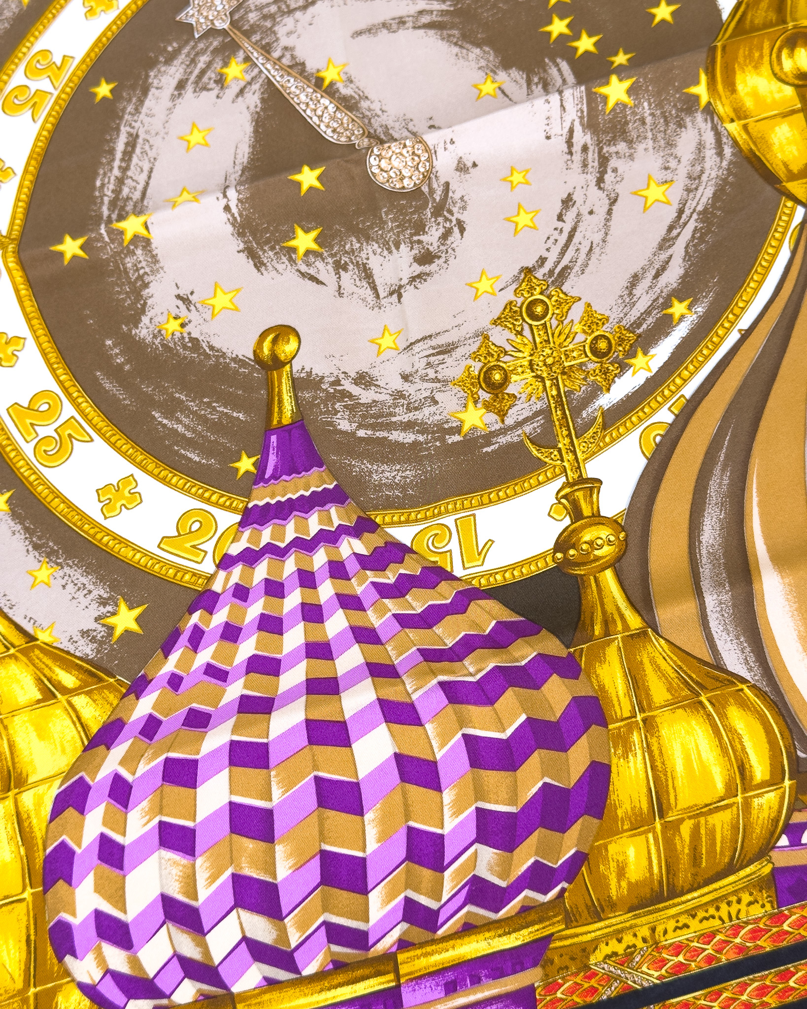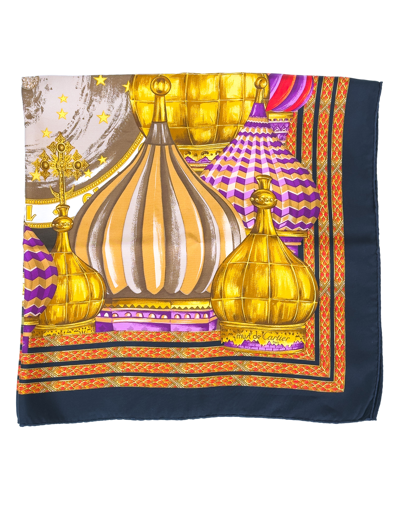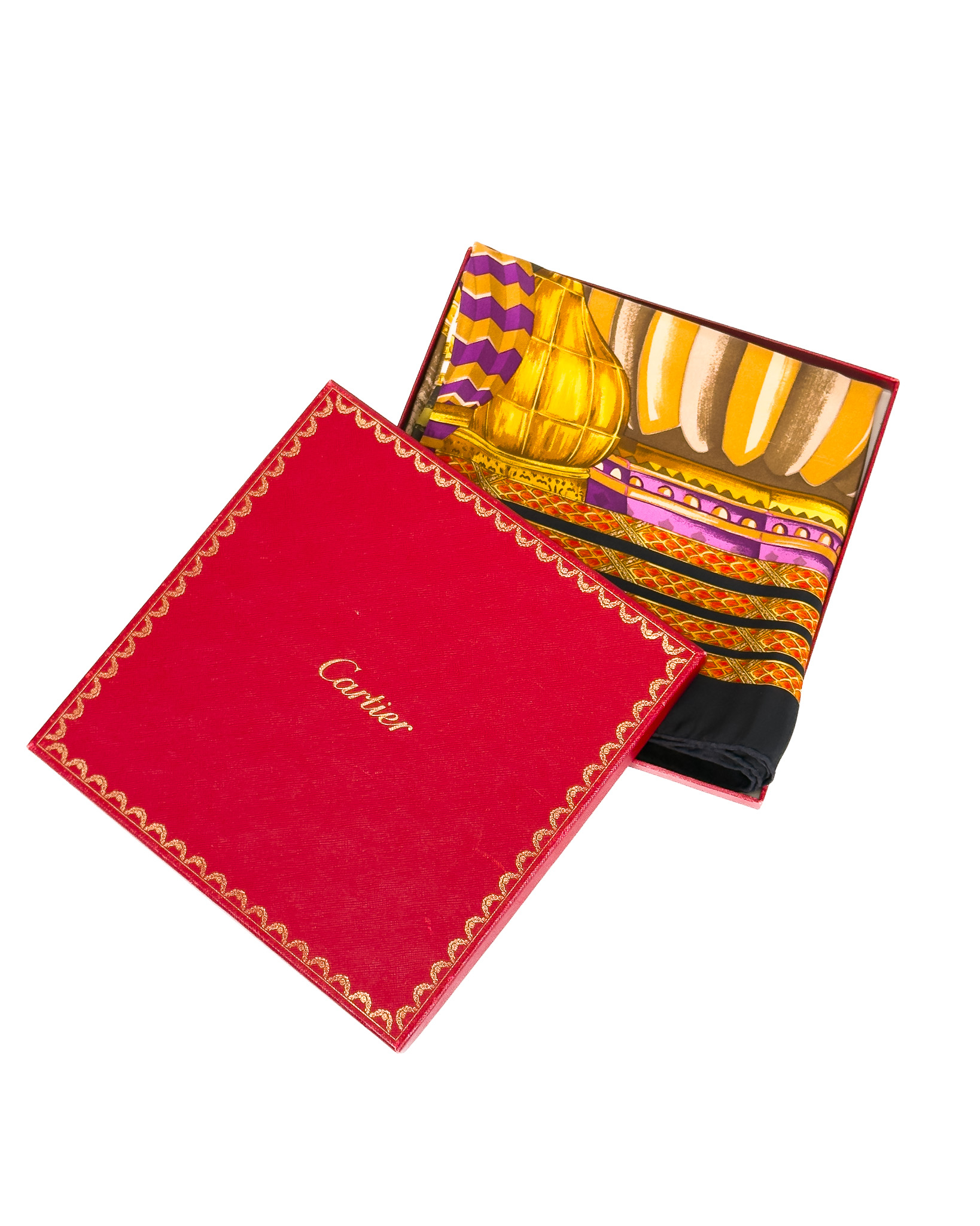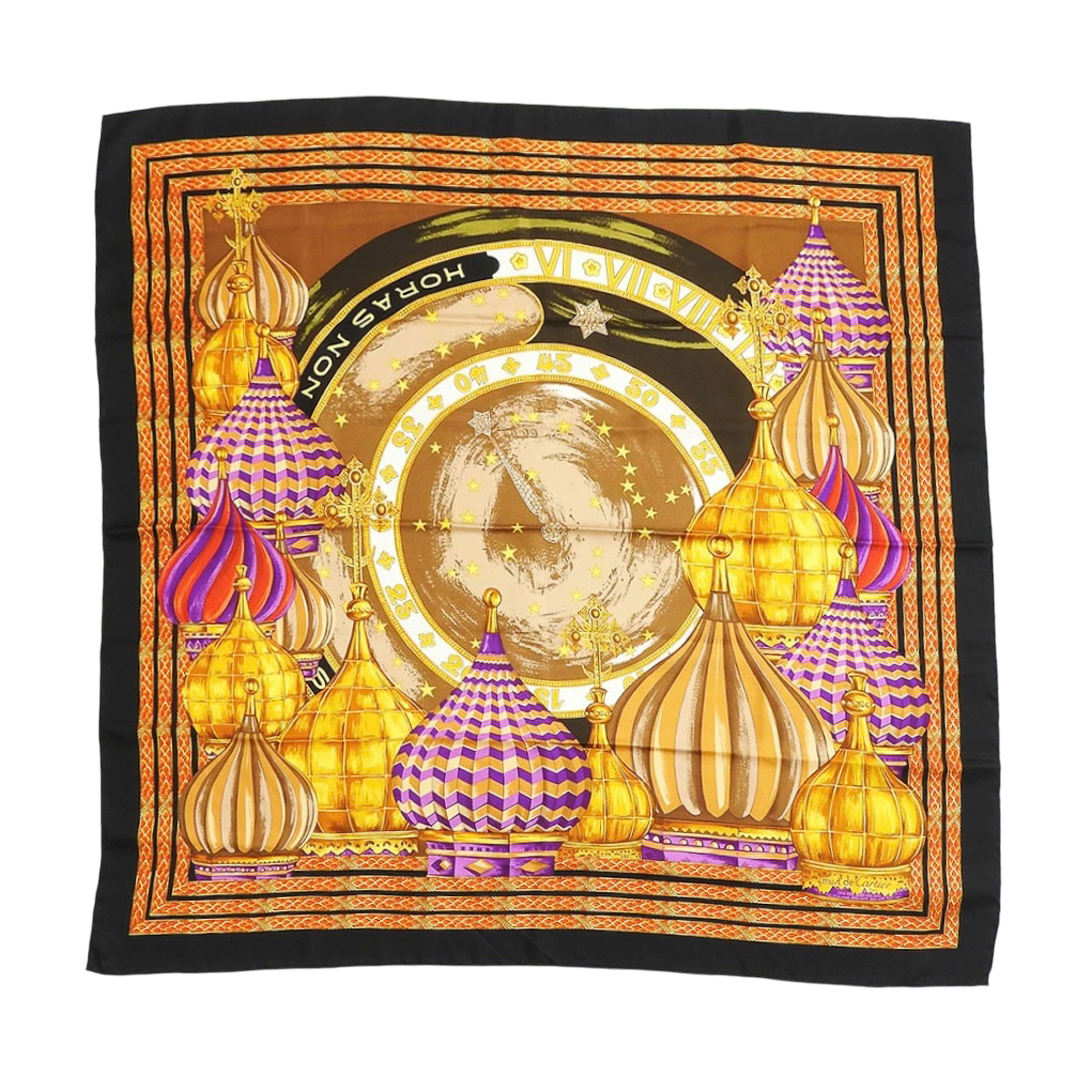 "Wielobarwna chusta ozdobiona grafiką zegara z logo marki, kwadratowy kształt, czarna lamówka, w zestawie z pudełkiem. Stan idealny. Wymiary: 88cm x 87cm."