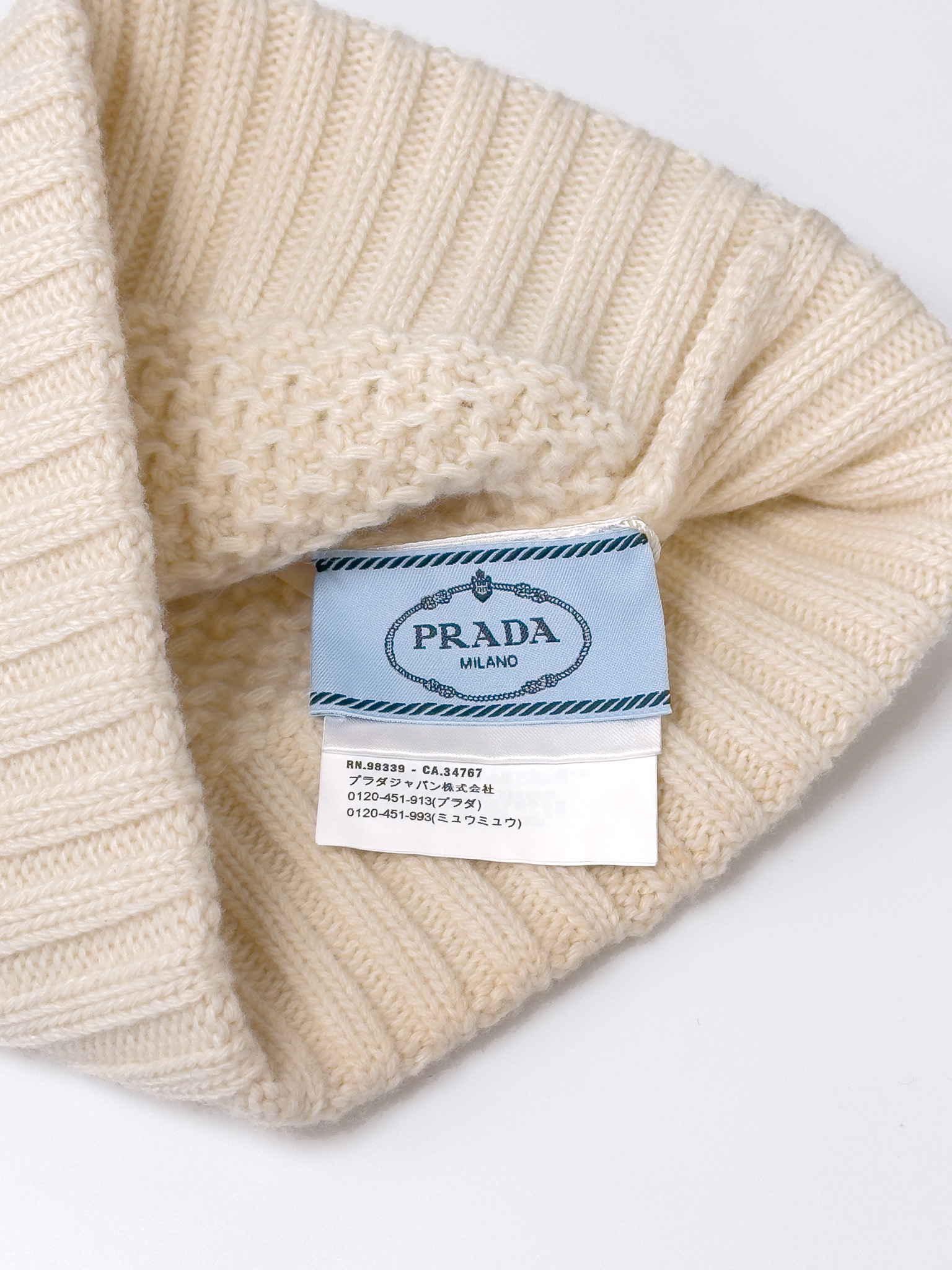 "Kremowa wełniano-kaszmirowa czapka, grubszy splot, odwijana, wykończona prążkowanym ściągaczem. Rozmiar z metki M. Skład: 70% wełna dziewicza, 30% kaszmir."