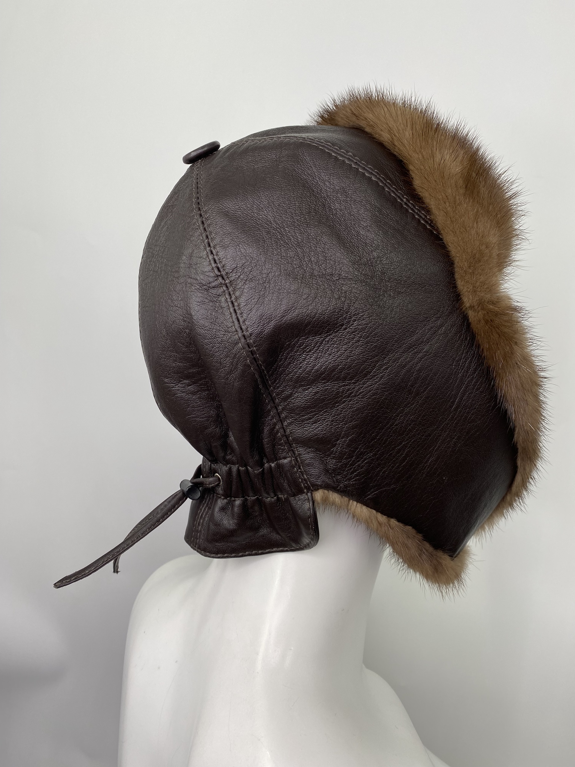 "brązowa czapka pilotka, skórzana, obszyta brązowym futrem z przodu i przy nausznikach, zapinana na zatrzaski, z tyłu ściągacz, szara podszewka."