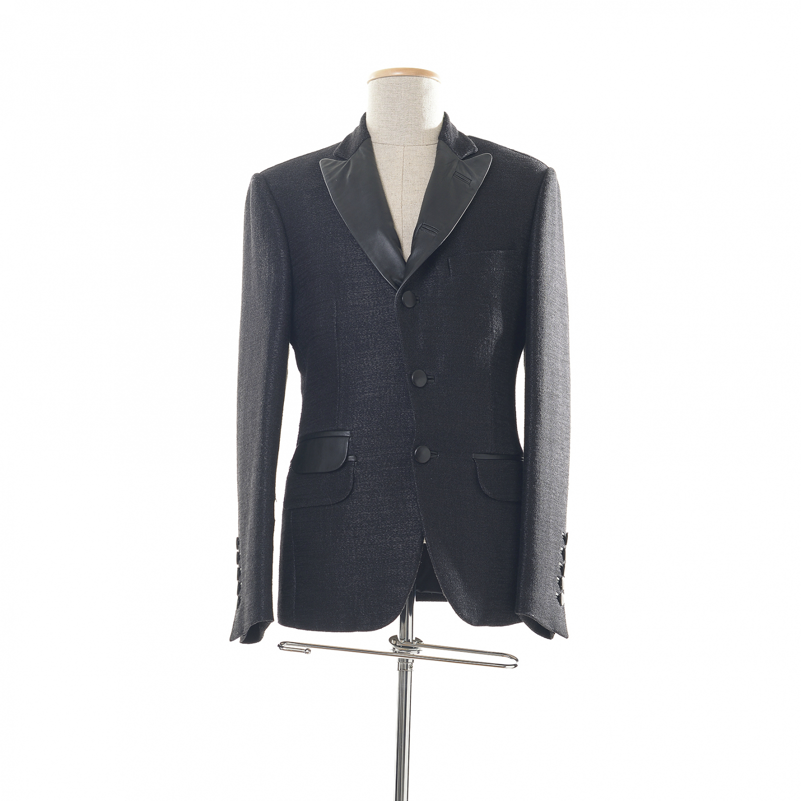 "Czarna marynarka ze srebrną nitką i elementami skóry. Wykonana z połączenia wełny i wiskozy. Rozmiar M"