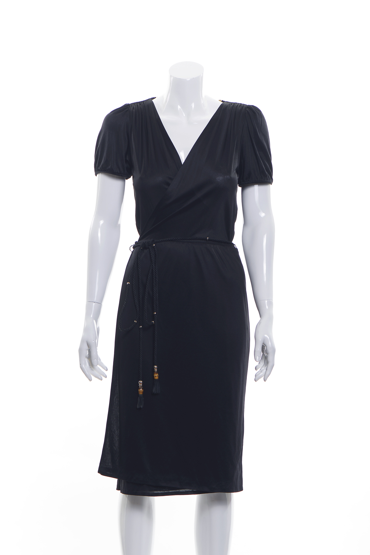 "Czarna sukienka kopertowa, z paseczkiem , krótki rękaw."