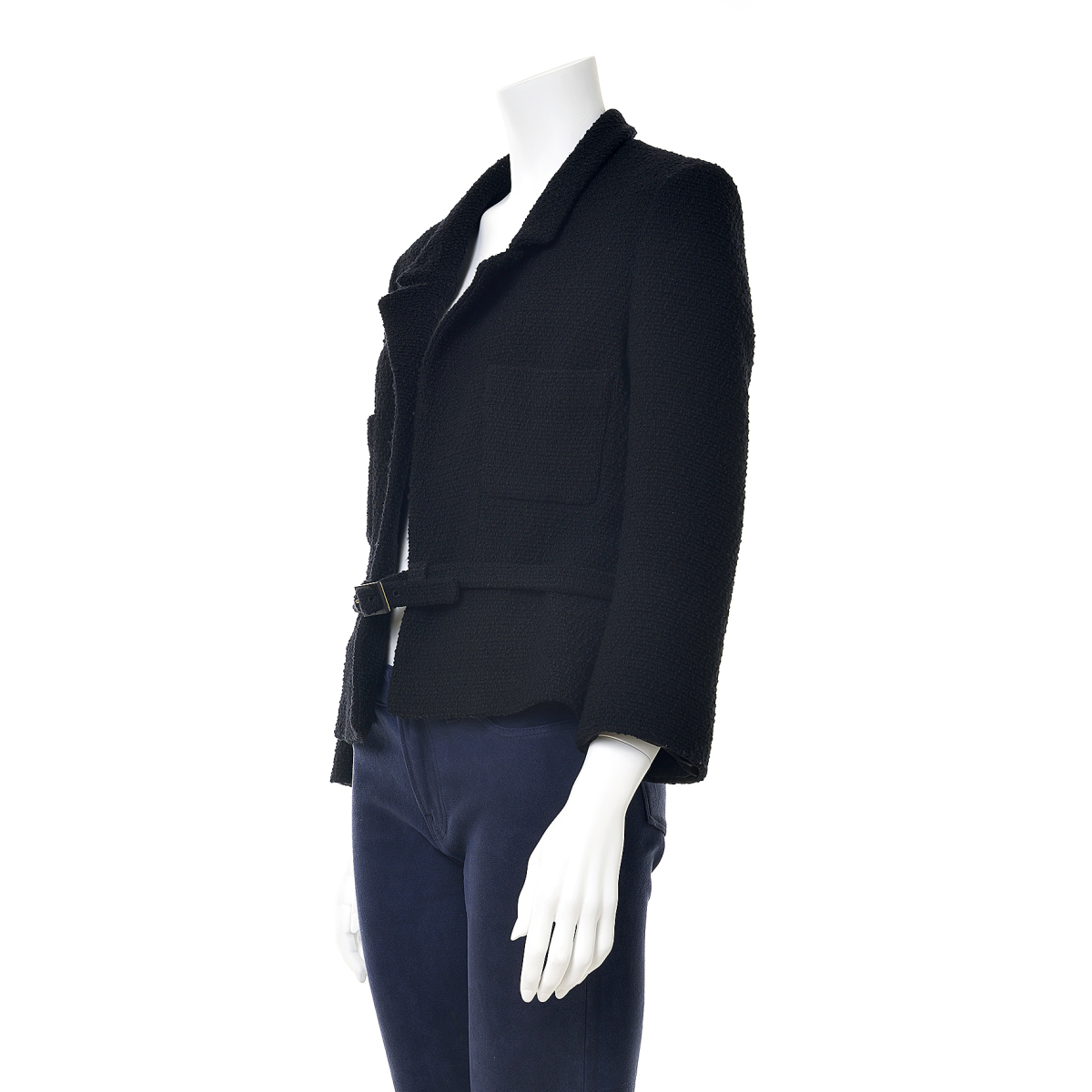 "Czarny tweedowy żakiet z paskiem zapinanym na klamerkę. Dopasowany , krótki klasyczny, wełna ,podszewka z jedwabiu . Posiada długi rękaw , rozmiar M"