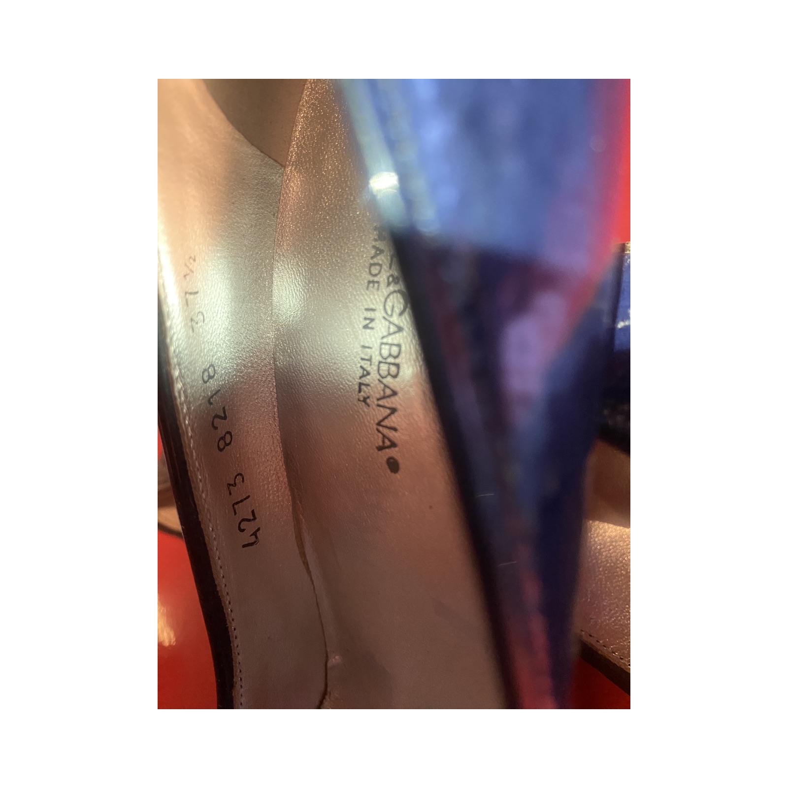 "Dolce&Gabbana czółenka. Bardzo wygodne i eleganckie. Skóra lakierowana. Piękny granat. Rozmiar włoskie 37,5. Ślady użytkowania widać na klamerkach i podeszwie, fleki w bardzo dobrym stanie. Wnętrze buta nie jest zniszczone."
