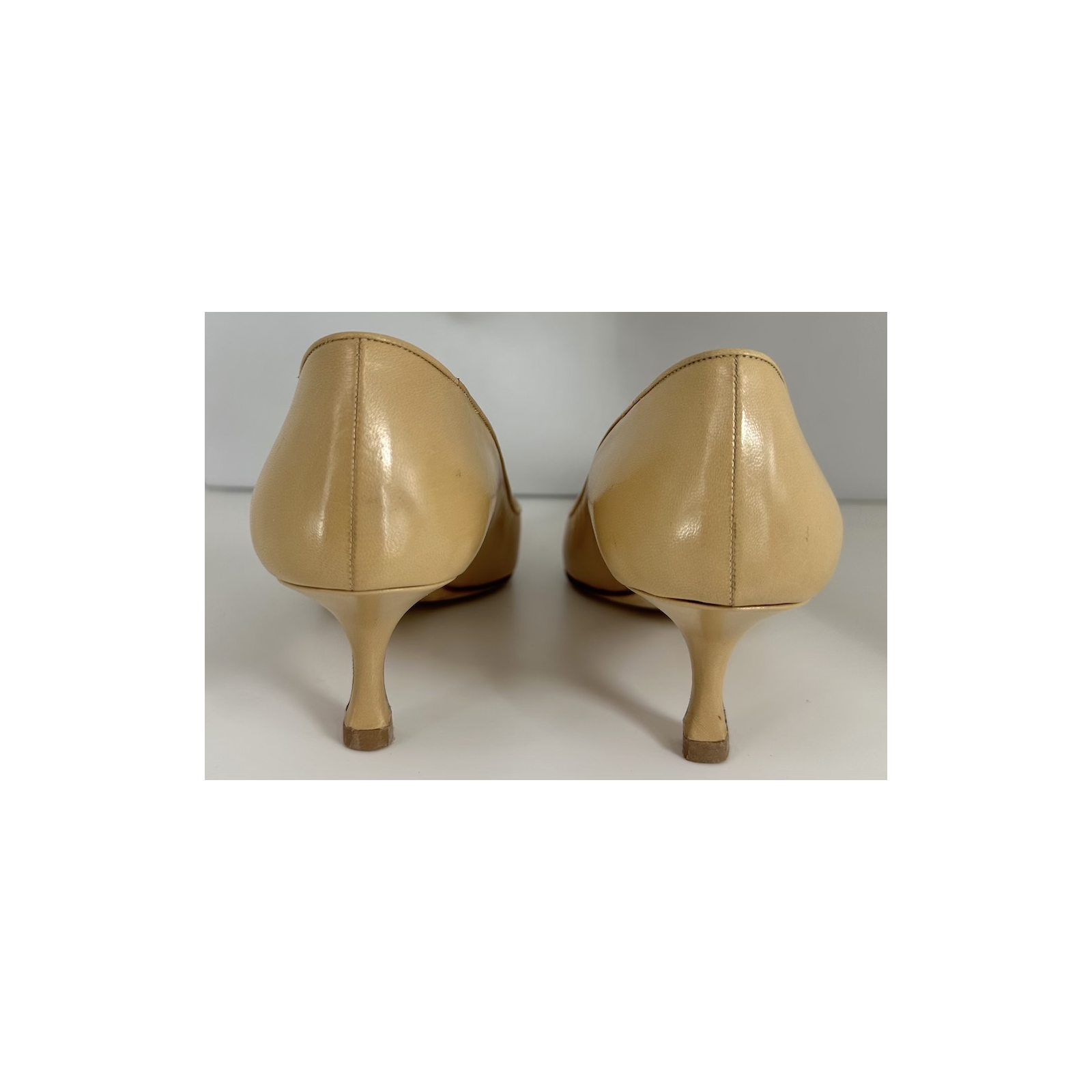 "beżowe klasyczne czółenka na niskim obcasie, nosek w szpic, skórzane, używane, widoczne zagięcia na skórze, rozmiar 38, wys. obcasa 6 cm."
