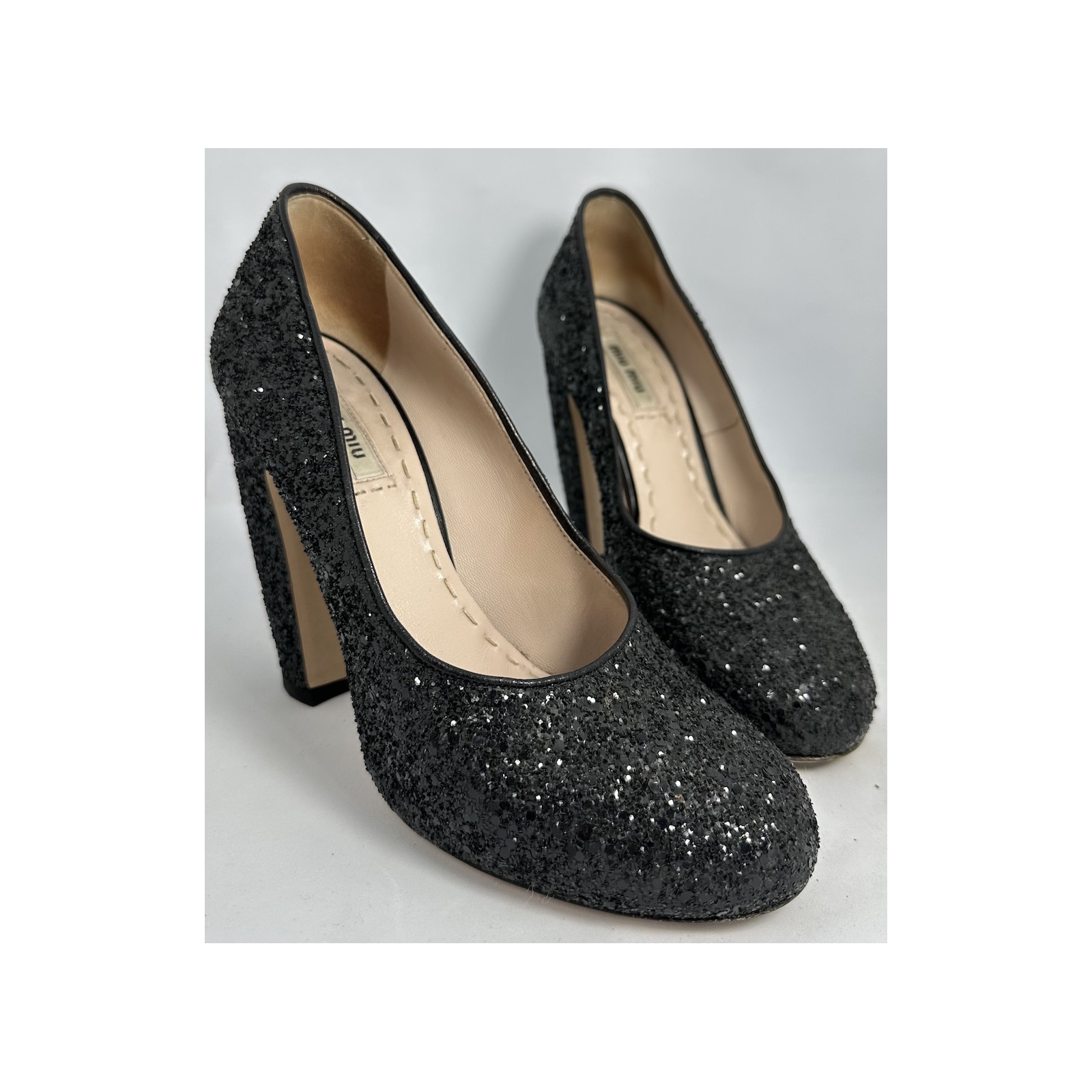 "czarne brokatowe czółenka, obcas słupkowy, używane, przetarcia na podeszwie i na skórze wewnątrz. Rozmiar 38, wys obcasa 12 cm."