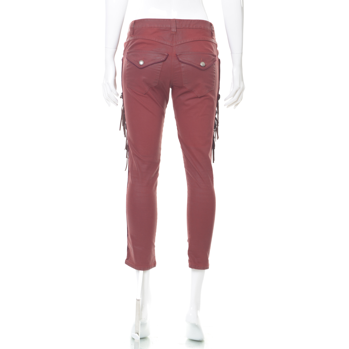 "Czerwone woskowane spodnie z frędzlami po bokach. Rozmiar 38 , długość 3/4"