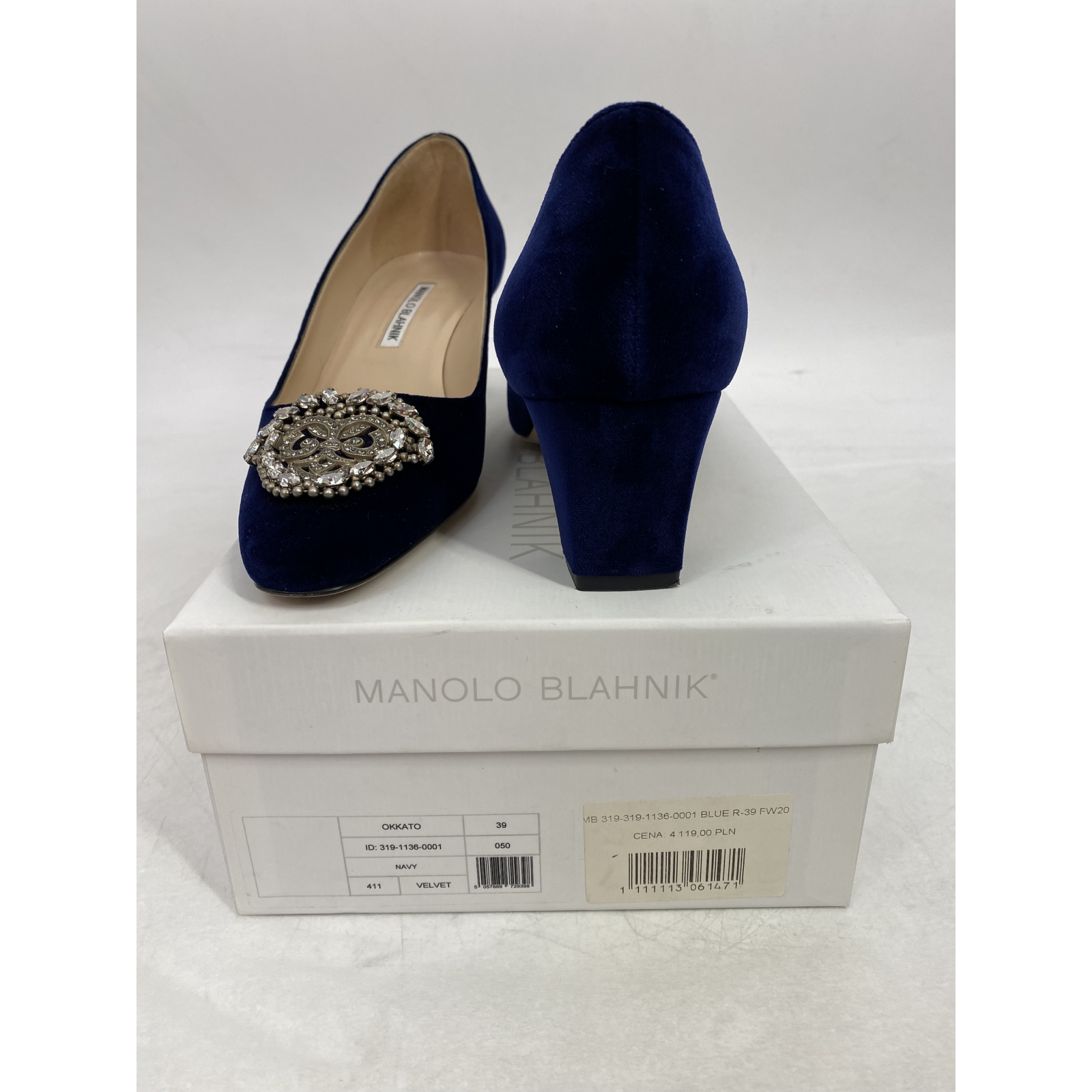 "welurowe, granatowe czółenka, na przodzie zdobienia z cyrkonii, obcas słupkowy 5,5 cm. Stan idealny, pudełko. Rozmiar 39. Model Okkato. Cena zakupu 4100,-"