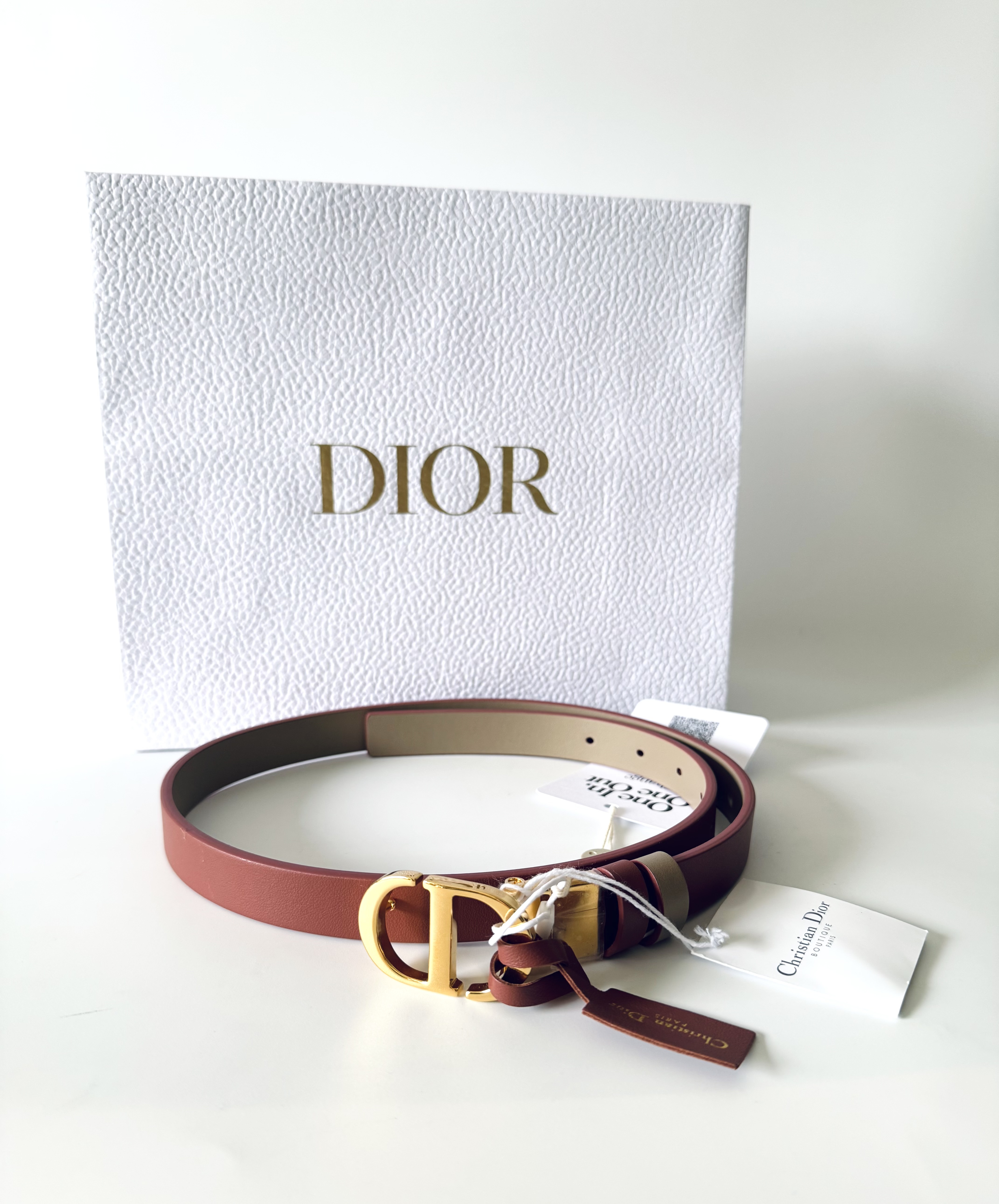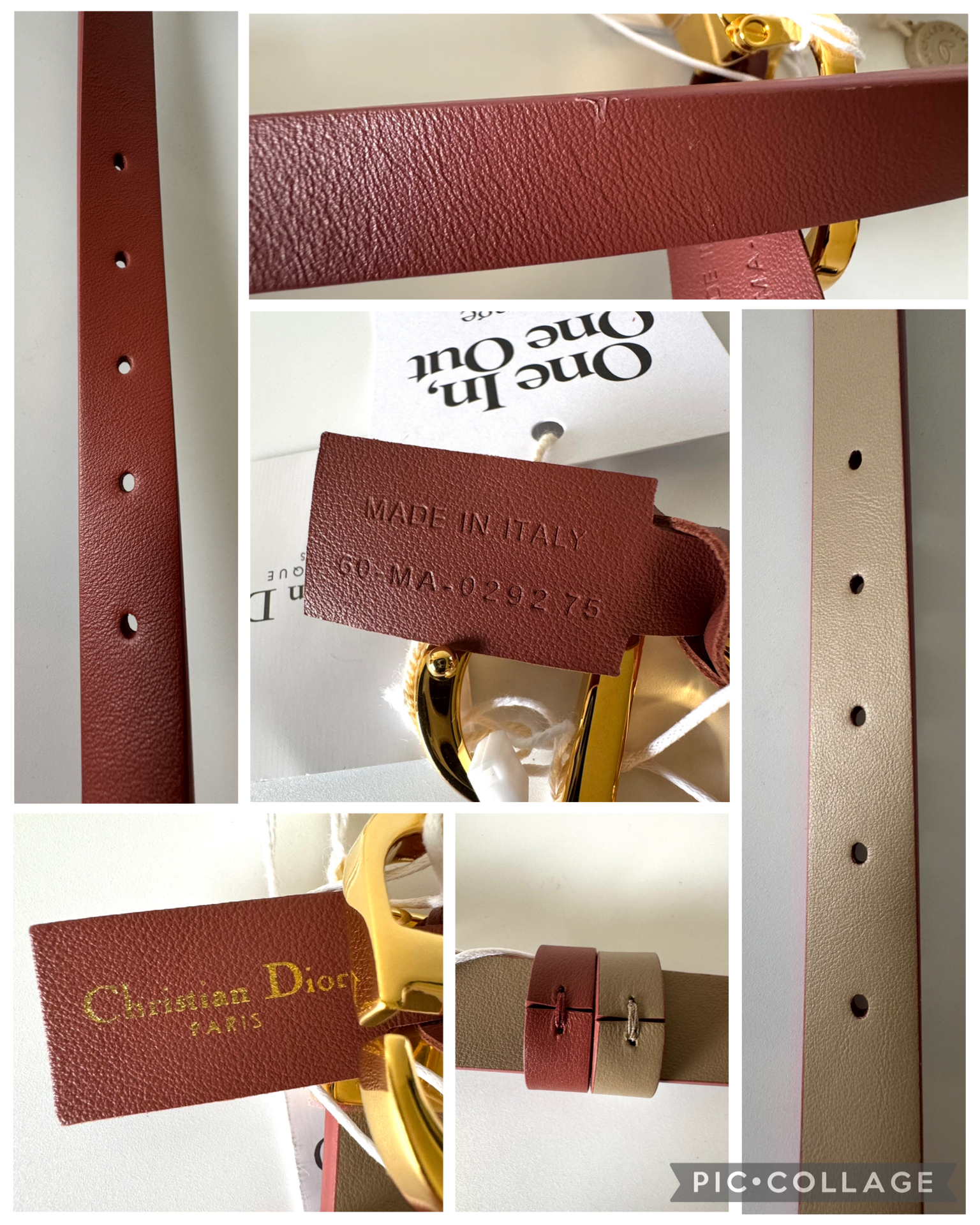 ▪️Wykonany z gładkiej skóry cielęcej w kolorze rdzawym z jednej strony i taupe z drugiej, ozdobiony jest kultową, błyszczącą, metalową klamrą „CD” w złotym wykończeniu.