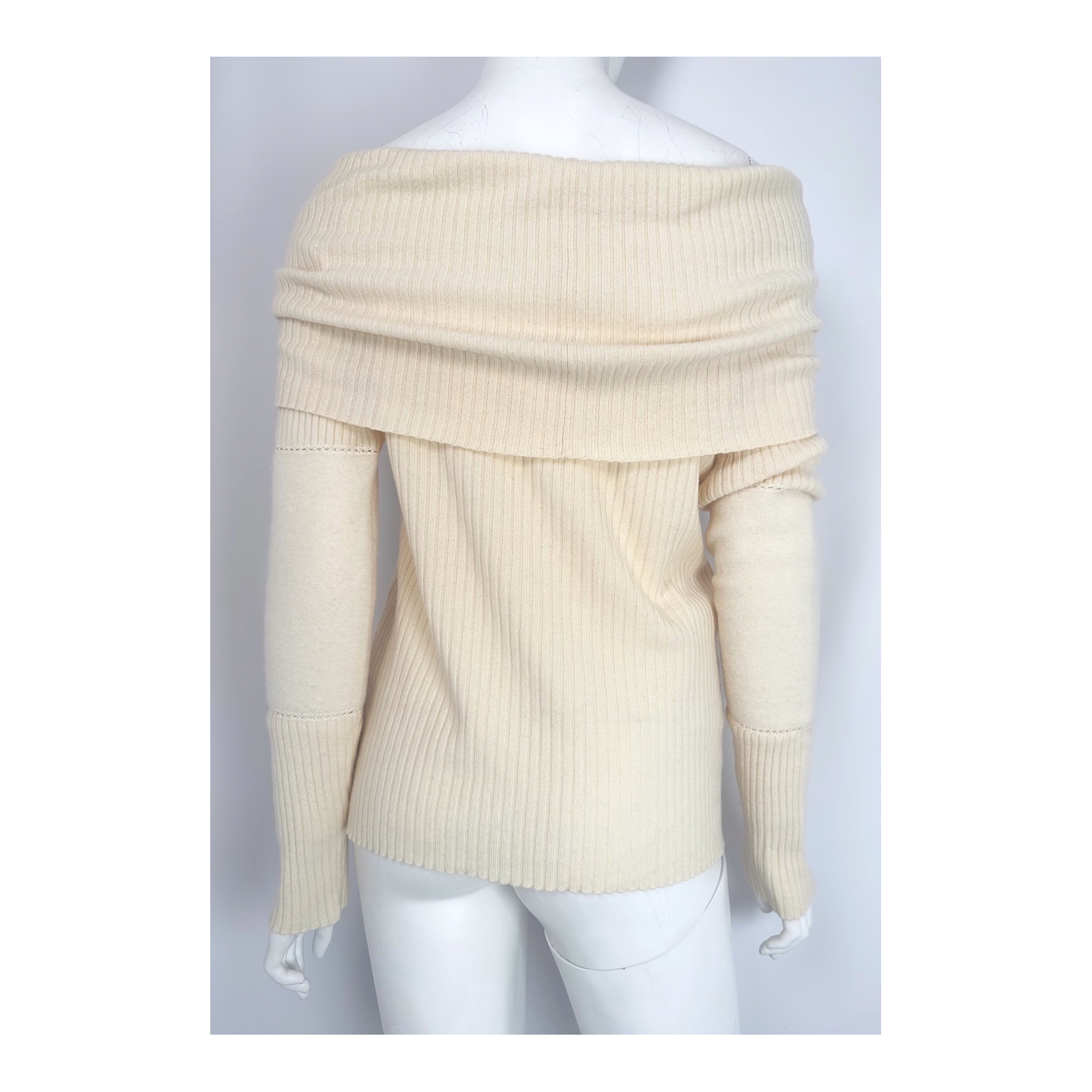 "Kremowy wełniany prążkowany sweter z szerokim golfem, wykończony skórą owczą, wywijany kołnierz, prosty krój, kieszeń ze wstawką skórzaną na piersi, zapinana na biały guzik, srebrne logo marki z przodu w dolnej części po lewej stronie, dekoracyjne transparentne przeszycia. Rozmiar z metki FR 38. Wyblakła metka ze składem. Wymiary: linia ramion 45cm, długość całkowita 50cm, długość rękawa 64cm."