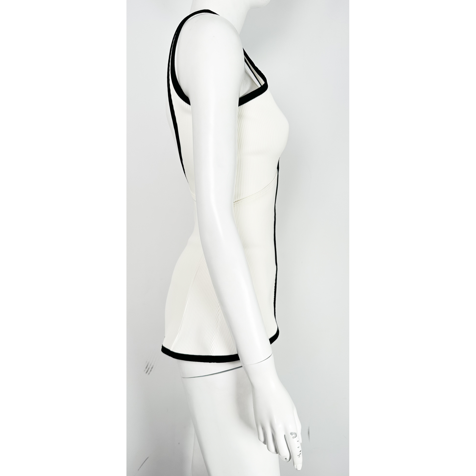 ""Śmietankowy/kremowy dwuczęściowy prążkowany komplet plażowy wykończony czarną lamówką, top na ramiączkach zapinany z przodu na logowany suwak, taliowany, dekolt w serek z przodu oraz z tyłu, krótszy zaokrąglony przód, majtki z wysokim stanem. Stan nowy, nieużywany. Rozmiar z metki 36. Skład: 72% poliamid, 28% elastan; podszewka: 72% poliamid, 28% elastan. Wymiary topu: szerokość mierzona od pachy do pachy 34cm, długość całkowita 64cm; wymiary majtek: szerokość w pasie 30,5cm, długość całkowita 30cm.""